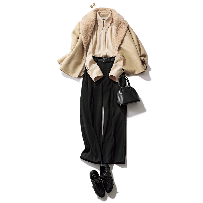 スニーカー¥10,990(ザラ/ザラ カスタマーサービス)コート[リバーシブル]¥27,940(エメル リファインズ/ユナイテッドアローズ カスタマーサービスデスク)シャツ¥71,500(コモン スウェーデン/ウィム ガゼット 玉川髙島屋S・C店)パンツ¥60,500(ザ サードマガジン/サードマガジン)バッグ¥60,500(メゾンヴァジック/ヴァジックジャパン)ベルト¥13,200(ドゥーブル/サロン アダム エ ロぺ)ピアス¥22,440(ラブ・エージェイ/ZUTTOHOLIC)