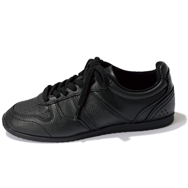 「紐もソールもオールブラックのレザースニーカーを黒パンツに繋げて、カジュアル感を抑制」