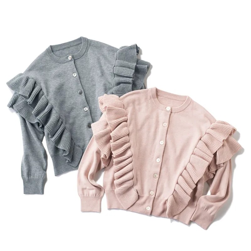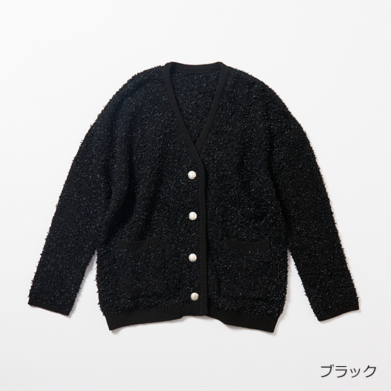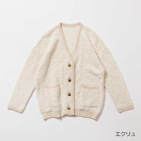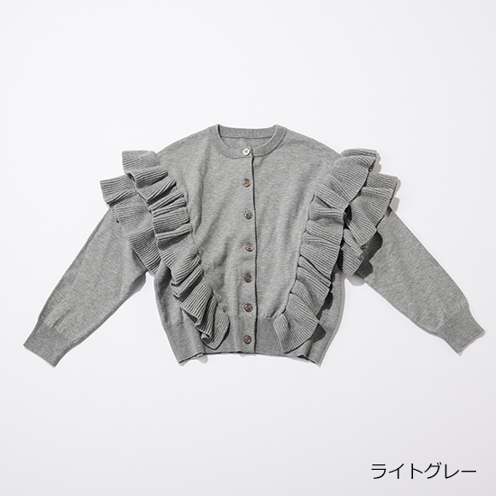 ハイゲージカーデのきちんと感を残しながら華やかさのある一枚は、フロントのやや大ぶりな蝶貝風ボタンがアクセント。ソフトな糸をふっくら編むことで、肌触りの良いふんわりとした柔らかな風合いに。身頃も袖もゆったりシルエットなのでランチ会や新年会にもおすすめです。ニットフリルカーディガン¥19,800→¥9,900[50%off](スリースクエア)