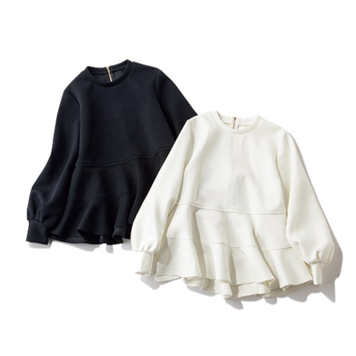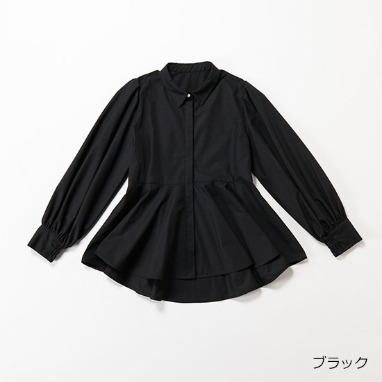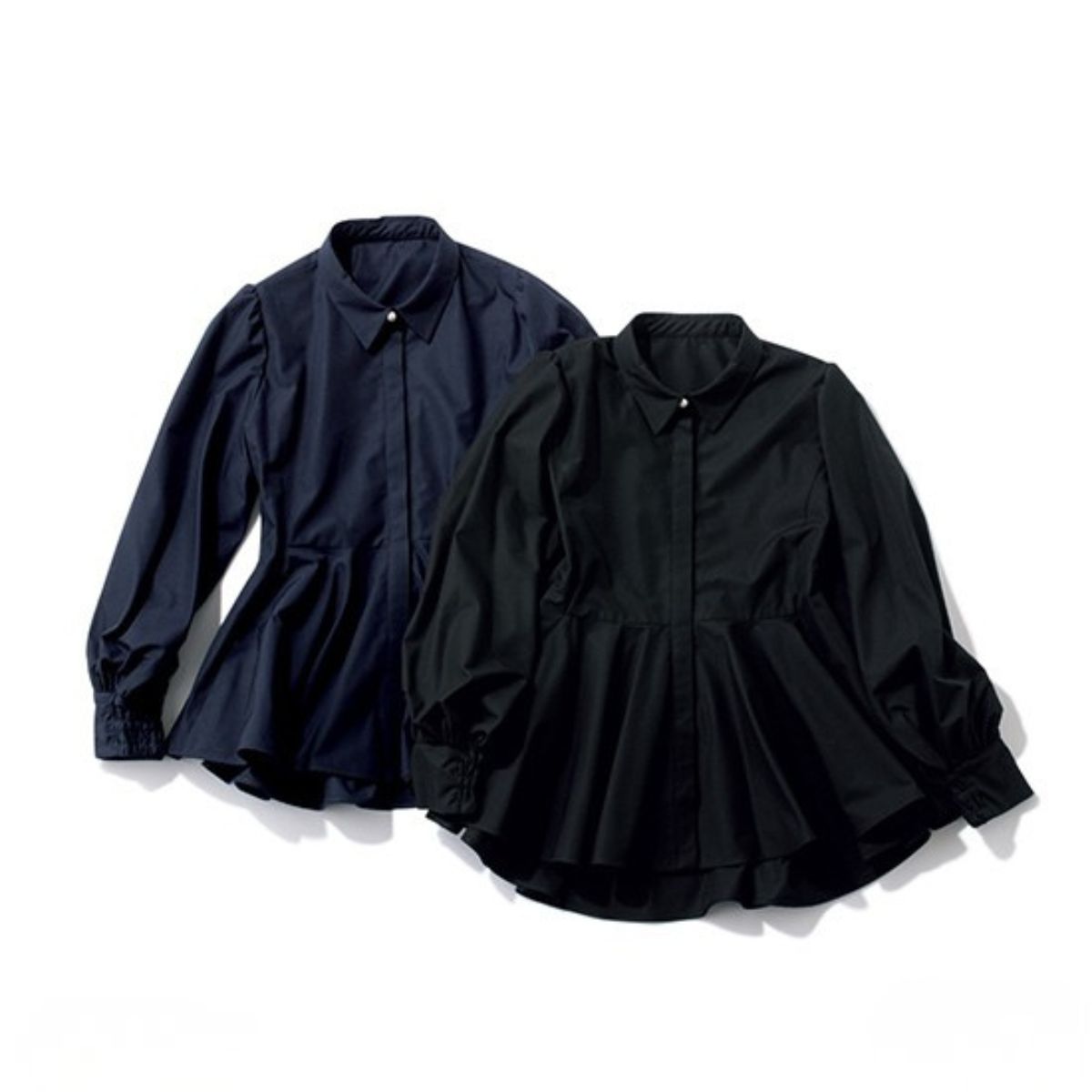 しわになりにくい生地を使ったペプラムブラウスは、カフスの裏側にギャザーゴムを入れてあるので機能性も抜群。一番上のボタンの1粒パールが効いて、品良く華やかさを後押ししてくれます。自宅で水洗い可能。ペプラムフレアブラウス¥18,700→¥12,100[35%off](スリースクエア)