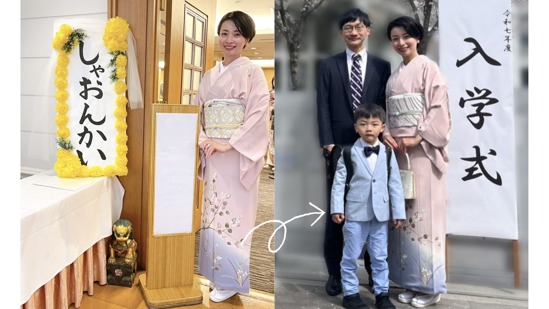 「夫の年単位の出張に家族でついて行ったので、昨年の卒入園は名古屋ではなく東京で参加しました。東京での式は初めてだったので、何を着ようか迷いに迷ってしまい……。当初は洋装のつもりでしたが、最終的に間違いなさそうな和装で参加することに。同じ着物なら名古屋からの荷物も少なくて済むし、準備が楽だと思ったのも理由です。卒園は終わりではなく入学へと続く通過点と考えているので、その時間の流れを感じるためにも同じ着物にしたのは正解だったかなと思います」奥平成美さん/38歳・主婦(9歳と7歳の男の子ママ)