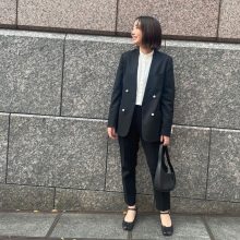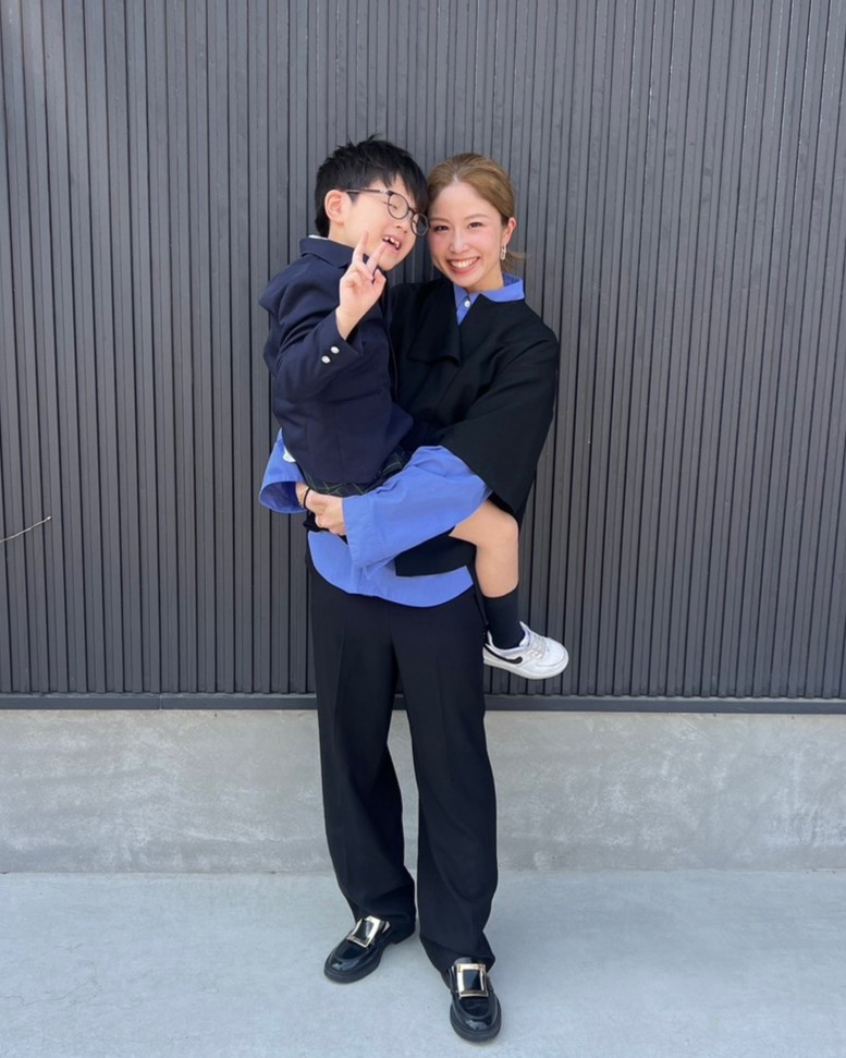 「少人数スクールで親もほぼ知った顔ばかりなので、卒園式はそこまでかしこまる必要はないと思い、好きな服を着ようと思いました。カッコいい感じを目指したかったので、普段からよく着ているエンフォルドで、手持ちのパンツと合いそうなトップスを追加購入。自分らしさを出すために中にブルーのシャツを着たのでカジュアルになりましたが、黒で揃えてセットアップっぽく着たことできちんと感が出たと思います」吉田幸奈さん/36歳・主婦(7歳と3歳の男の子、5歳の女の子ママ)
