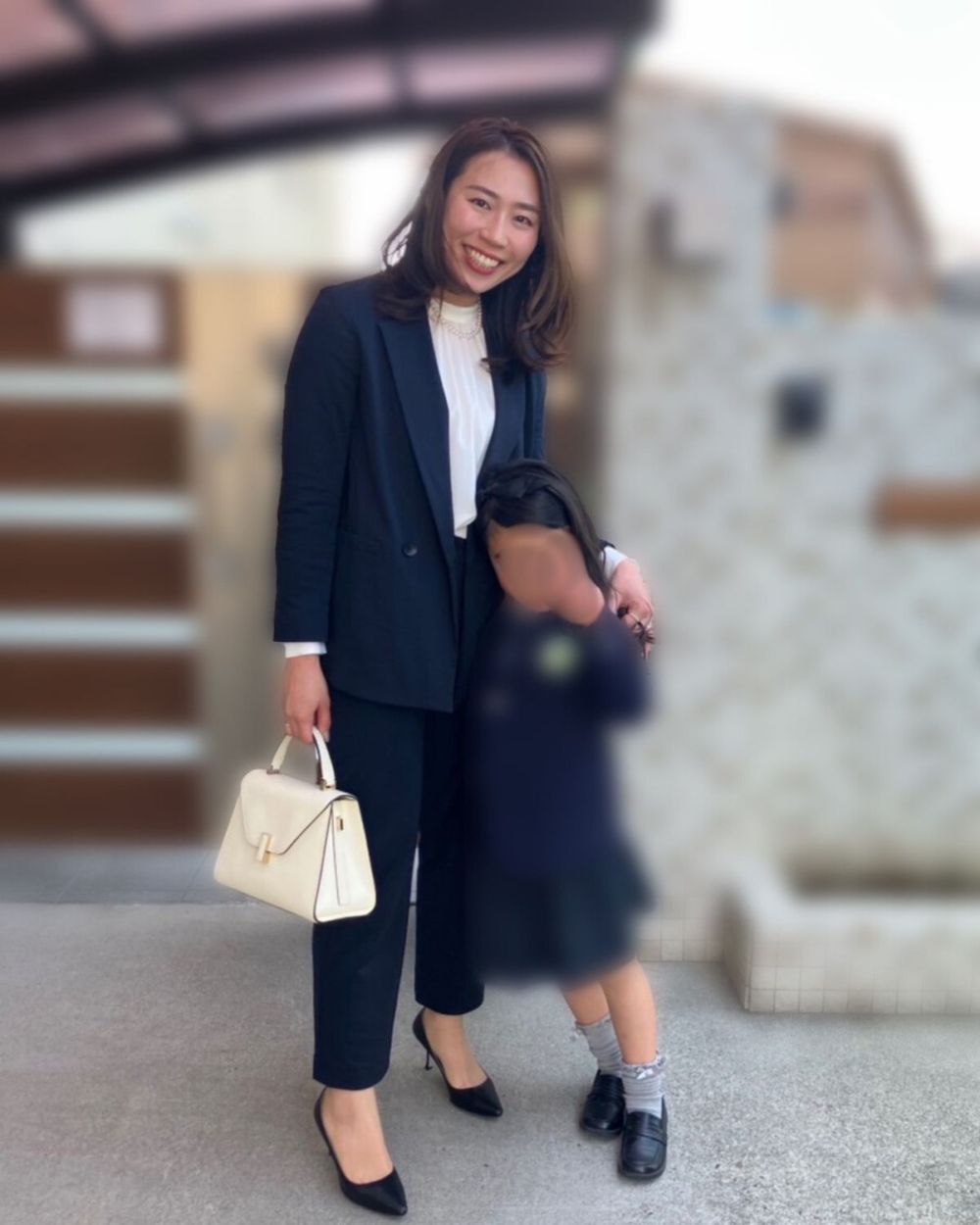 「息子の卒園式がスーツだったので、娘のときはもう少し華やかにしようとツイードジレをオーダーメイド。しかし当日いざ着てみたらやっぱりスーツのほうが良かったかもと思い、急遽変更。トゥモローランドのスーツはシルエットもキレイだし、ストレッチも効いていて動きやすいので、いつ着ても間違いありません。屋外は少し寒かったので、気温的にもジレよりもジャケットで正解でした。和装のママもいましたが、謝恩会前に着替えに帰っていたので、そのまま参加できるスーツは便利でした」飯田綾子さん/37歳・航空関係勤務(9歳の男の子と6歳の女の子ママ)