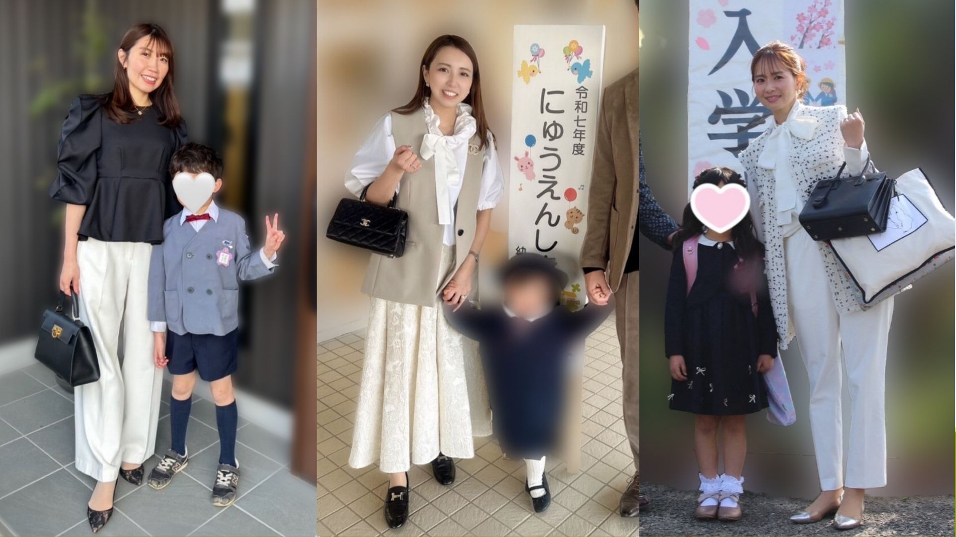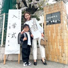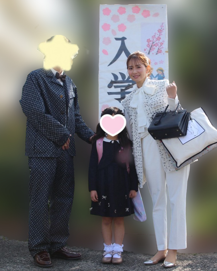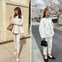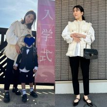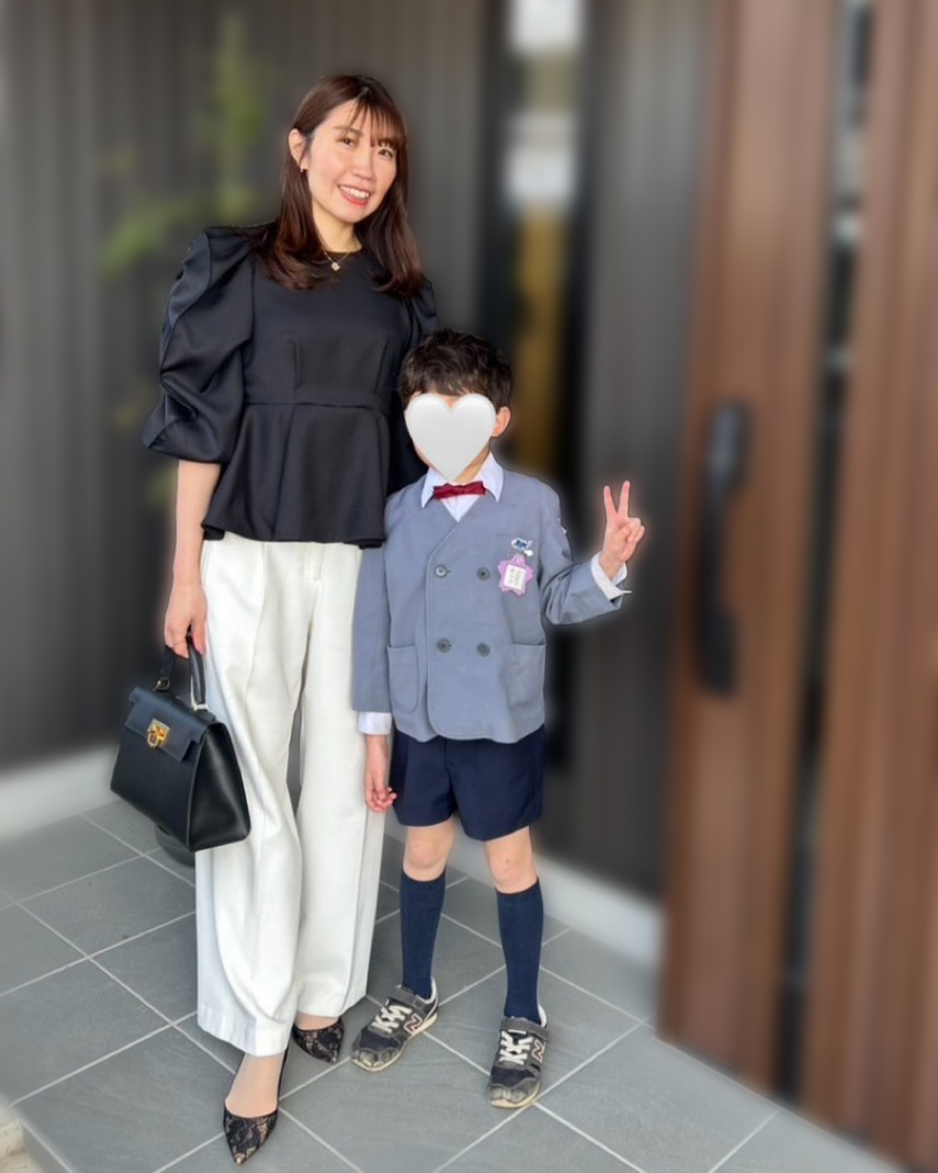 「入学式は立ったり座ったりとママも動く場面が多いので、パンツスタイルと決めていました。去年の次男の入学式で着たジャケットを着回す予定だったので、同じような写真になるのもなと思い、ボトムスの色を黒から白にチェンジ。子どもの門出の日だからこそ、明るく前向きな印象の白を着るのはありだと感じました。華やかで存在感のある白ブラウスでしたが、同色のパンツを合わせることで派手すぎず上品にまとまりました」園田里奈さん/38歳・サロン経営(11歳と8歳と6歳の男の子ママ)