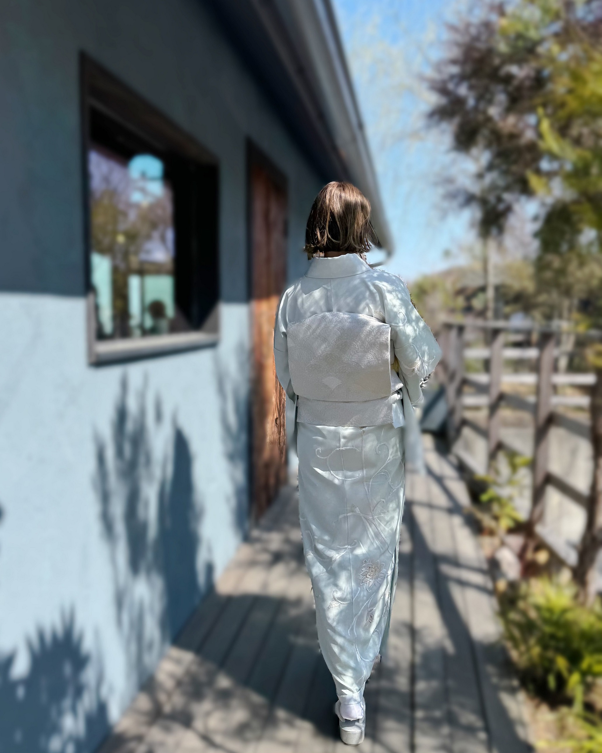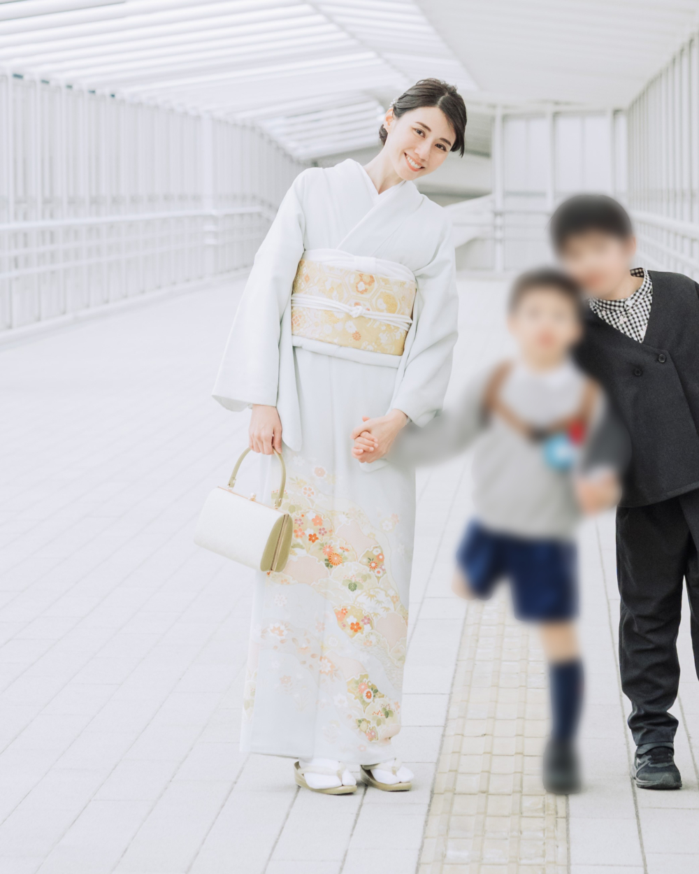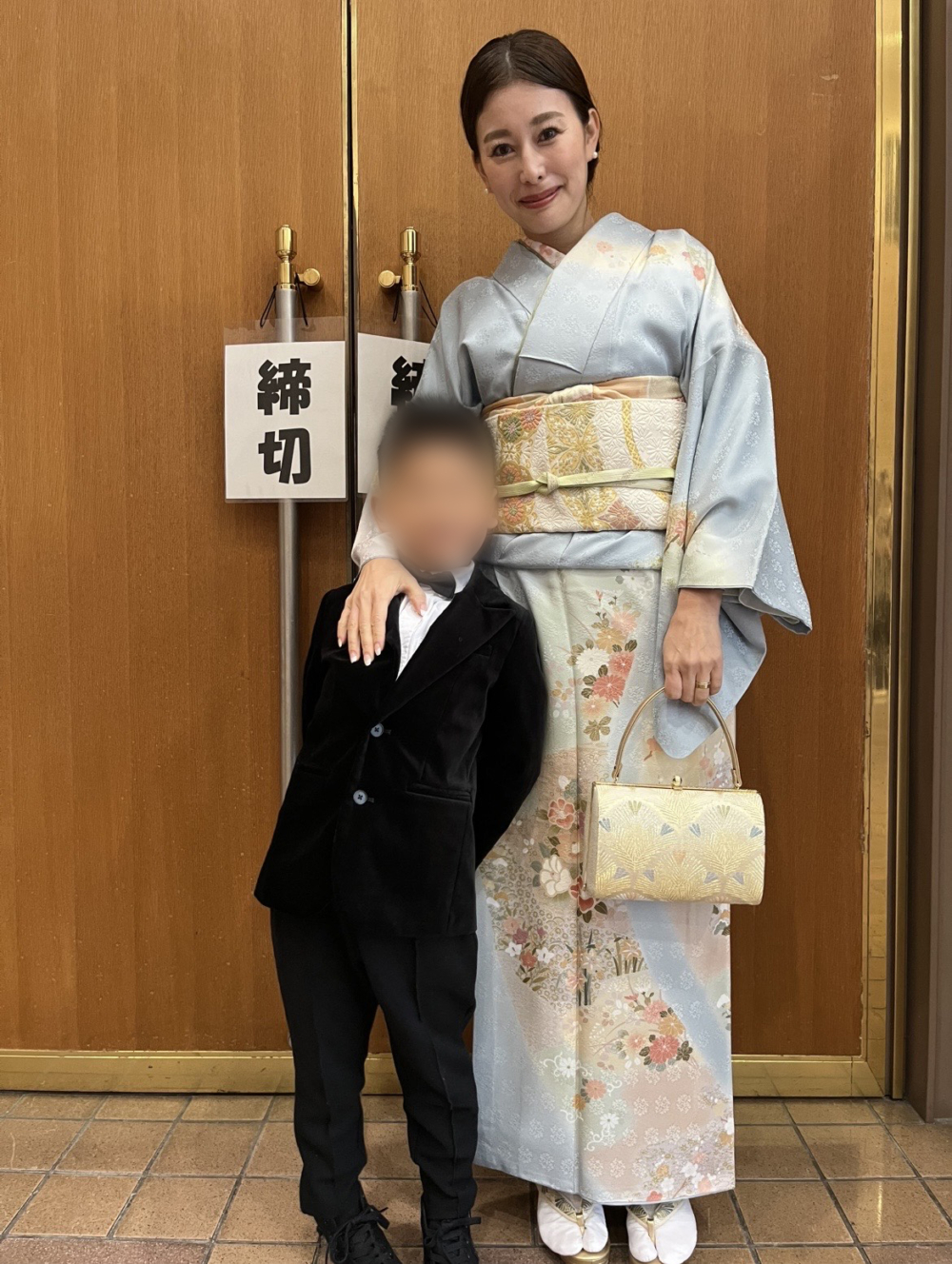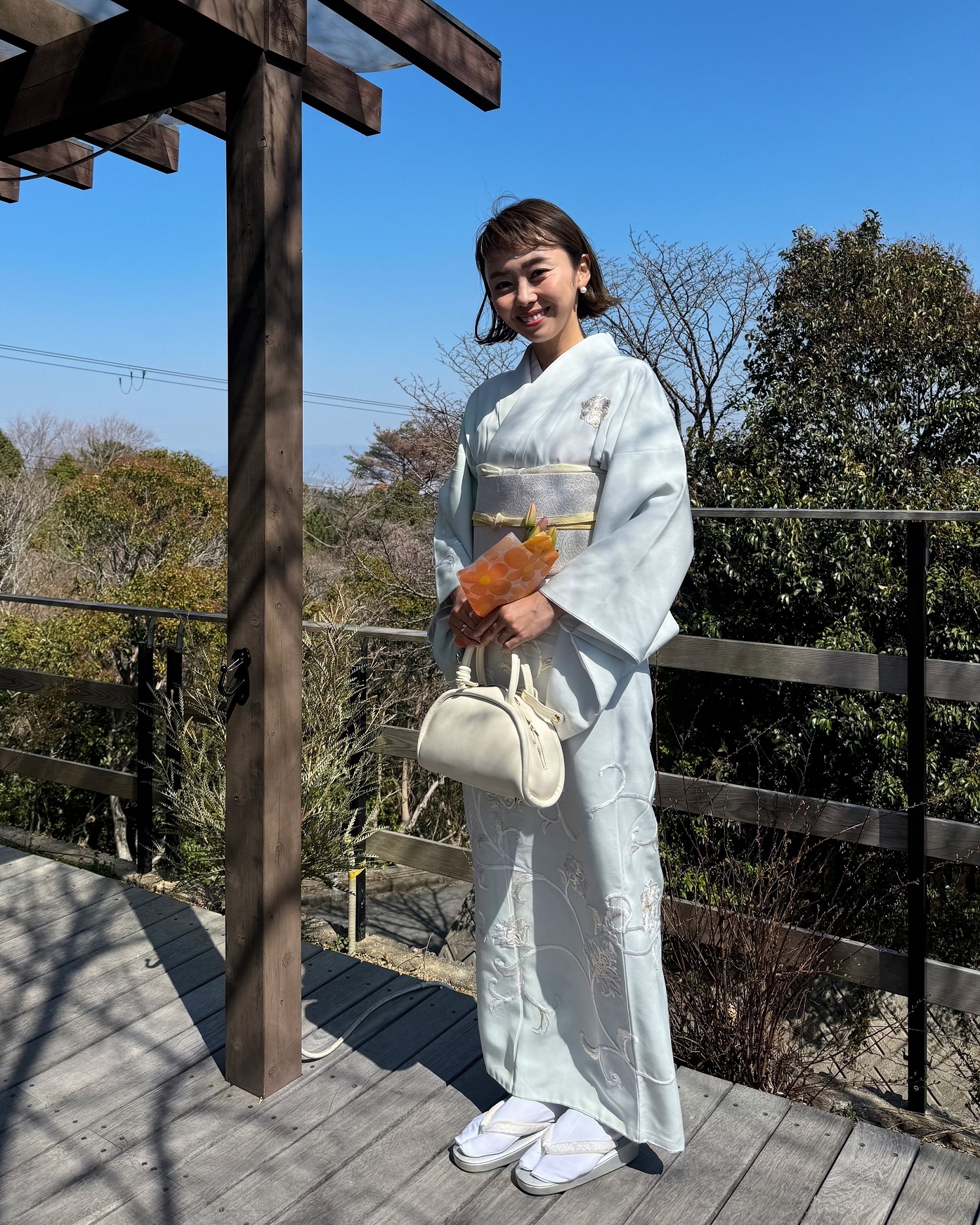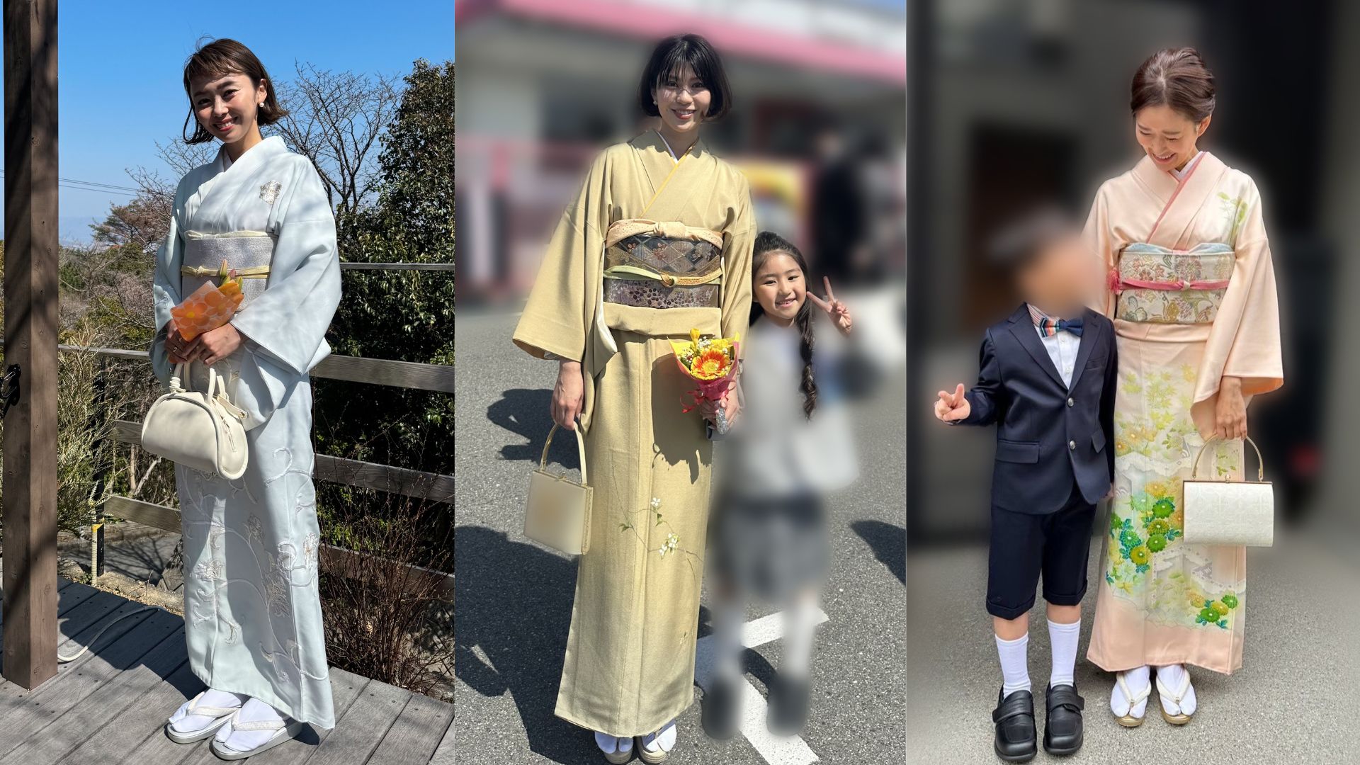 「息子の卒園式は、仲良しのママたちとみんなで思い出に着物を着ようという話に。商品数が多いRENCAというサイトで、訪問着も帯もまとめてレンタルしました。薄い水色が上品で、手刺繍の模様も華やか。バッグは私がDONOBANとコラボしたもので、普段使いだけでなく、着物にもぴったりです。着付けは友人に紹介してもらった、西宮にあるNymphaeaというトータルビューティーサロンでお願いしました。きれいに着付けていただき大満足です」松本亜希さん/40歳(7歳の男の子ママ)