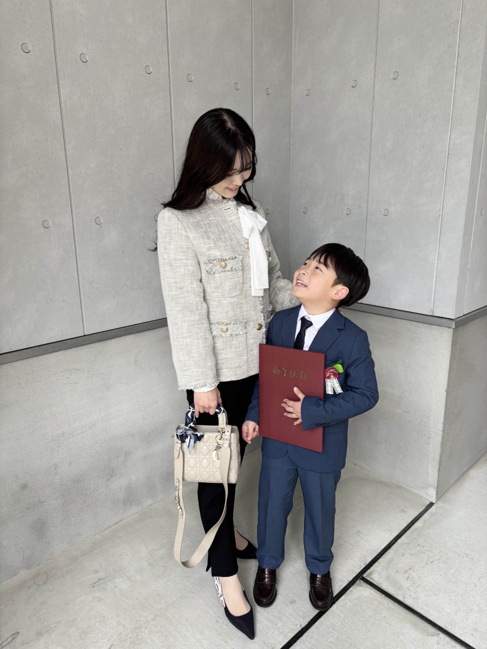 「甘めのコーディネートが好きなので、フォーマル用のワンピースを着るか悩みましたが、デニムなどと合わせて普段使いもできる服を選びました。ジャケットはアルアバイルで新調したもので、主張しすぎないゴールドボタンと柔らかいカラーが上品。普段よく使うシルバーアクセともなじんでくれます。ボールジィのブラウスは、リボンをチラ見せして華やかに。リアラ バイ ピージーのパンツは裏起毛なので、まだまだ寒い時期でも冷え知らず。小物はすべて大好きなディオールで揃えました」夏目美幸さん/37歳(7歳の男の子ママ)