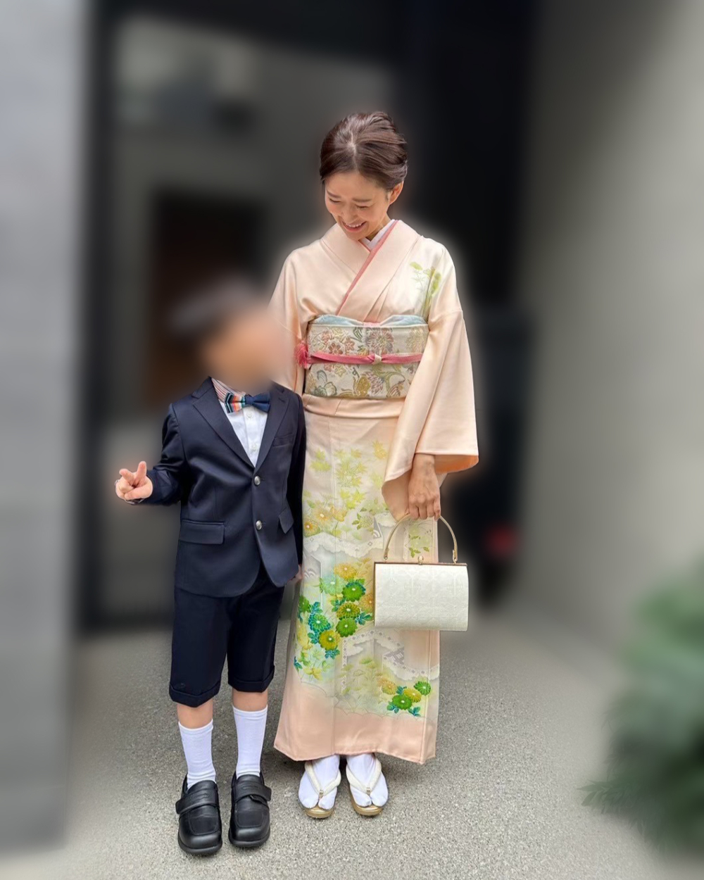 「長女のときから子どもの行事はすべて着物を着ていたので、長男の卒園式も同様に。保育園でも着物での参列者が多いと先輩ママから聞いていたのも、理由のひとつです。高島屋で義母が購入したという訪問着は、落ち着いた色合いで卒園式らしい雰囲気が気に入っています。着付けとヘアセットは、これまで何度もお願いしているおはなはんで。下の子もいるので、出張着付けはバタバタせずに準備ができて助かりました」浅川あかりさん/39歳(9歳と1歳の女の子、6歳の男の子ママ)
