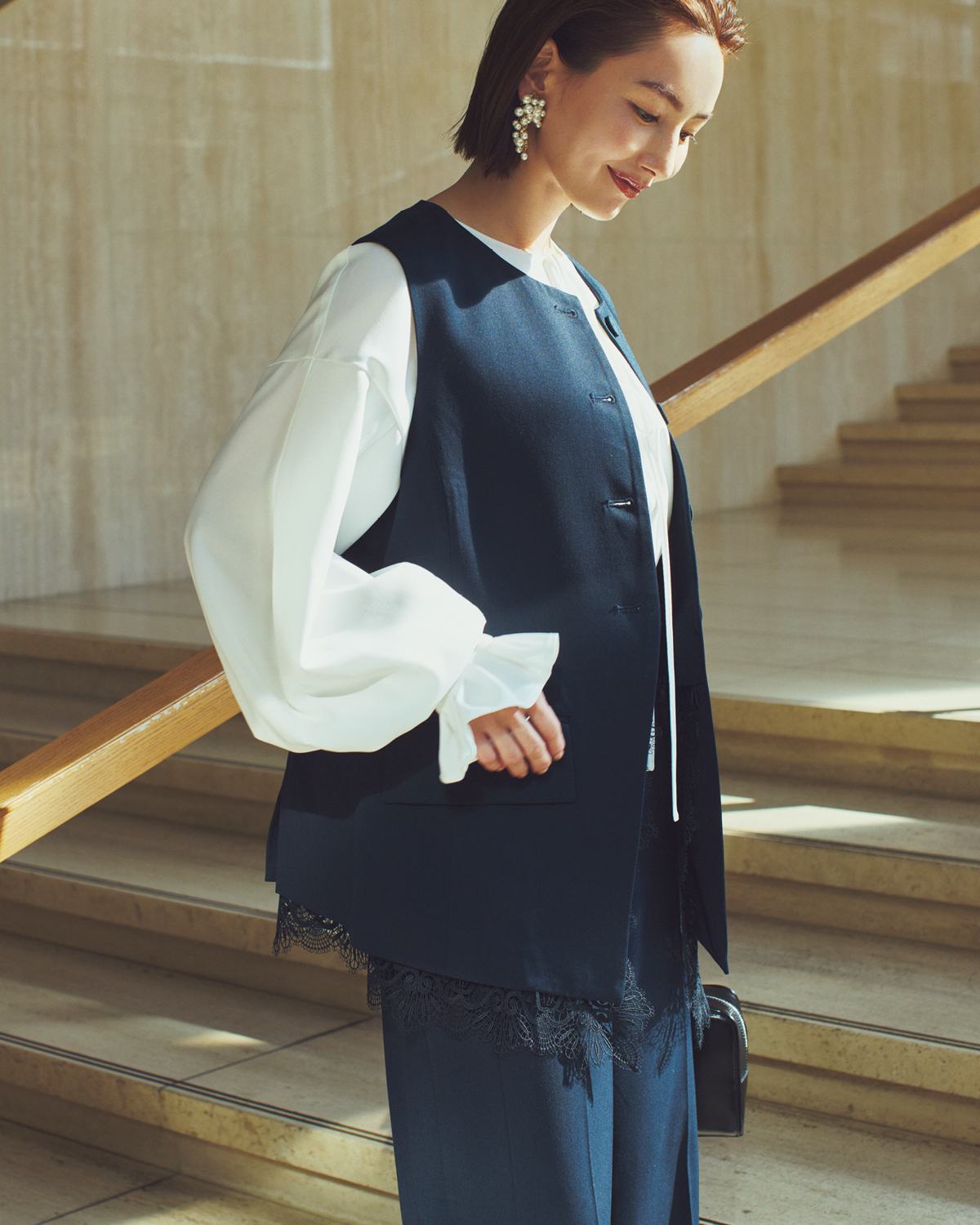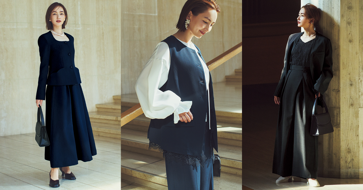 セレモニーシーンでも、旬のオシャレを楽しみたい人におすすめなのが、ベストとパンツのセットアップ。式典の日はブラウス合わせで華やかに。当日の気温によってインするものも調整しやすく、レイヤードで表情が変わるのも魅力。程よいオーバーサイズがスタイルアップも叶えてくれます。