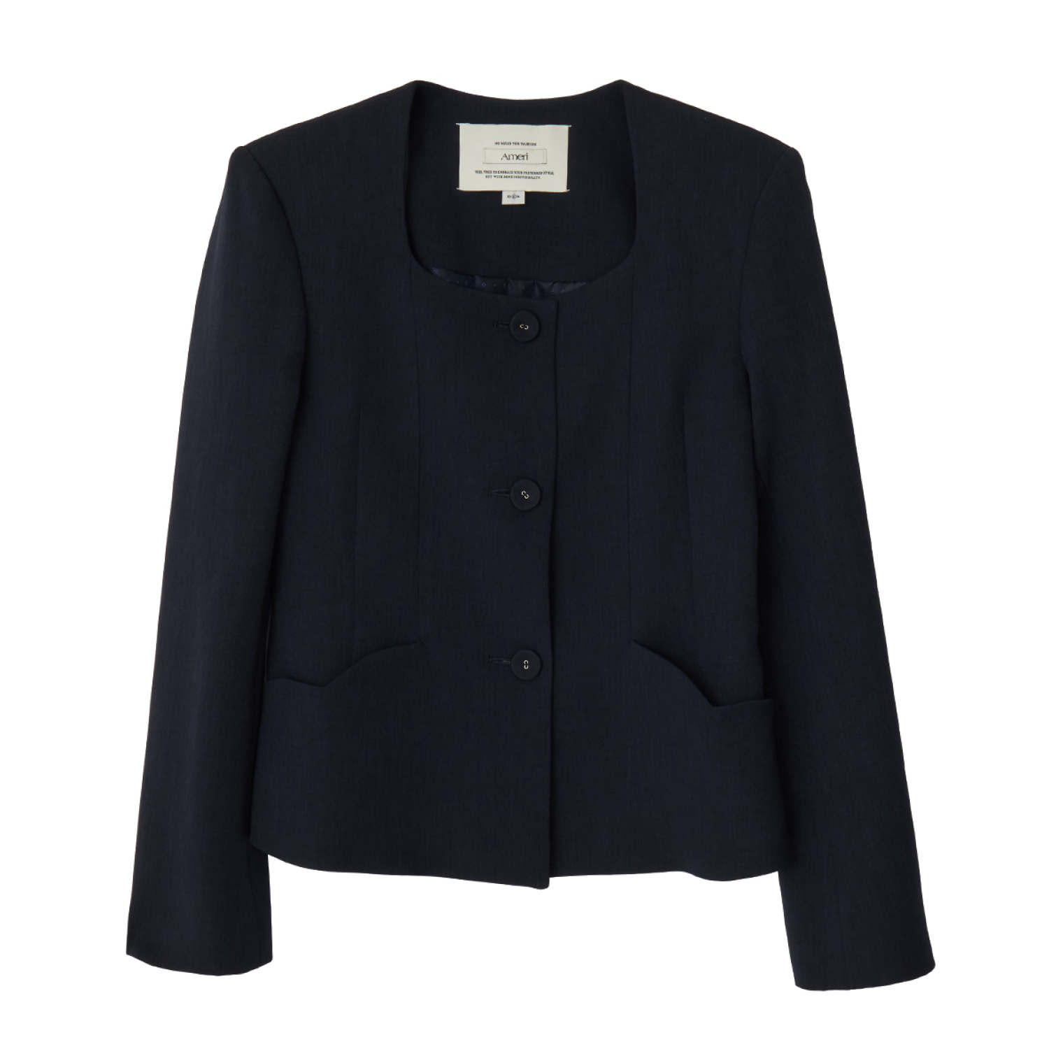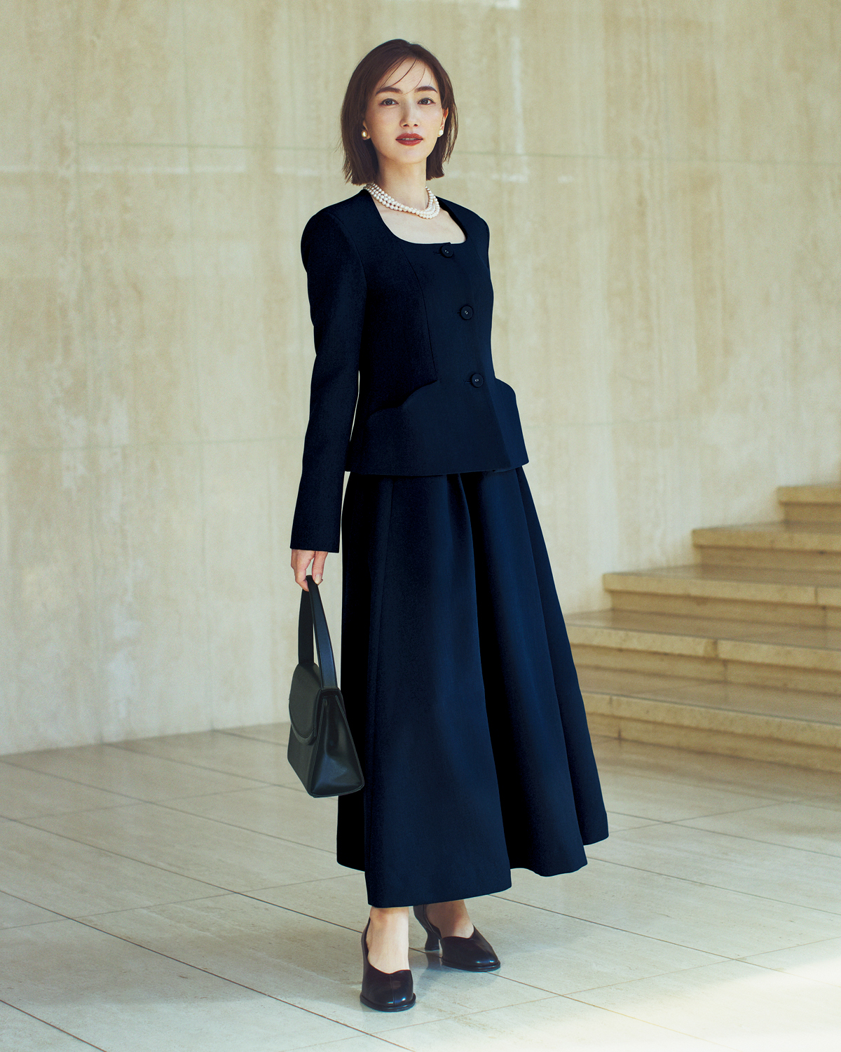 思い出に残る日こそ、母としての装いに自分らしさを大切にしたい。正統派なネイビージャケットながら、スクエアネックが印象的な一枚はベストな選択。共布のくるみボタン、ハート形のスカラップをあしらったポケットが、セレモニーにふさわしい上品さを添えて。タックがつくる構築的なフォルムと裾にかけて量感をもたせたフレアスカートが、さりげなくモードなニュアンスを加えてくれます。