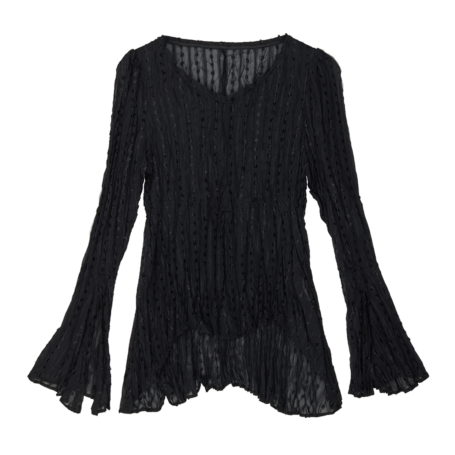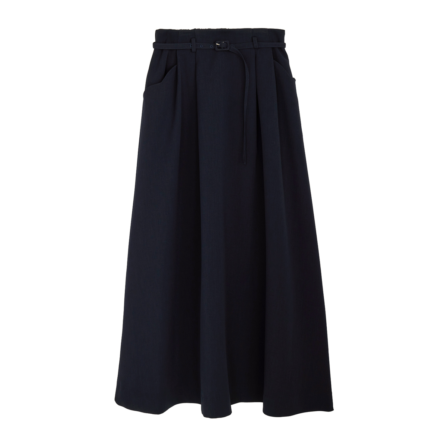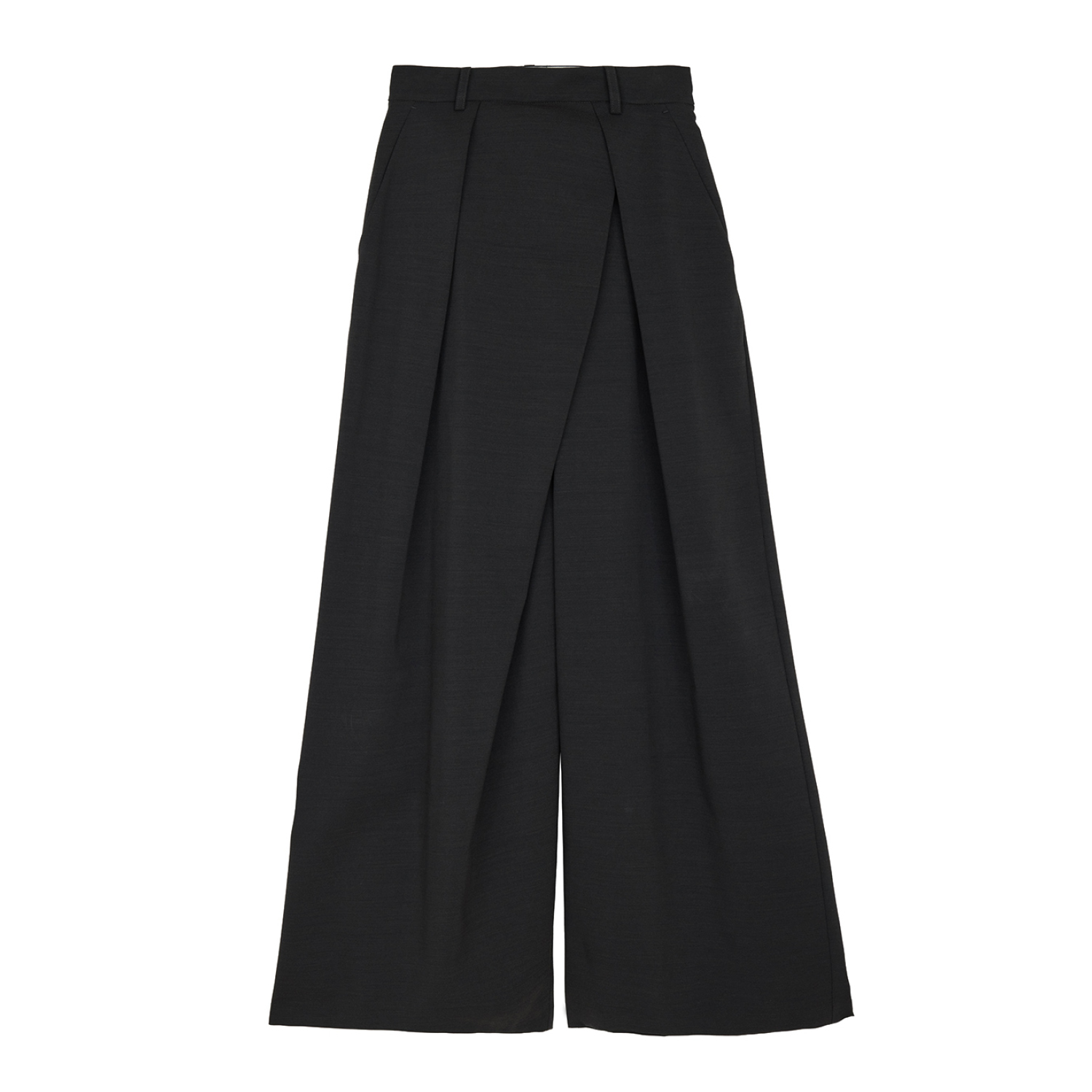 セレモニーにはワッシャートップスをインして、さりげなく華を添えて。アシンメトリーなタックが曲線的なフォルムを描くパンツはスカートのように見えつつも、足さばきの良さが魅力。ハイウエストかつ、あえて丈が長めの設計だから、人気の〝走れる〟パンプスを合わせることで、よりスマートに映えるバランスに。