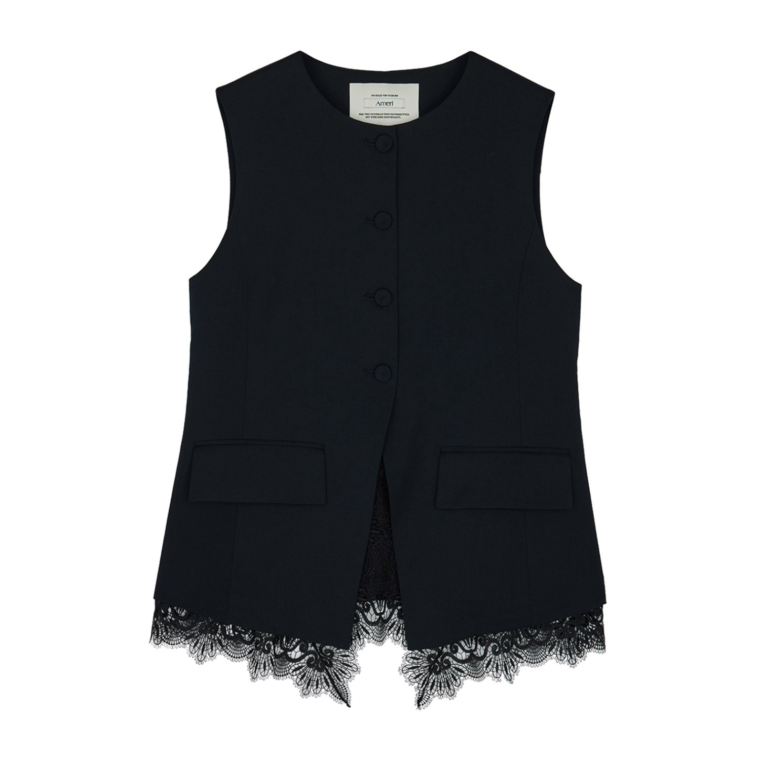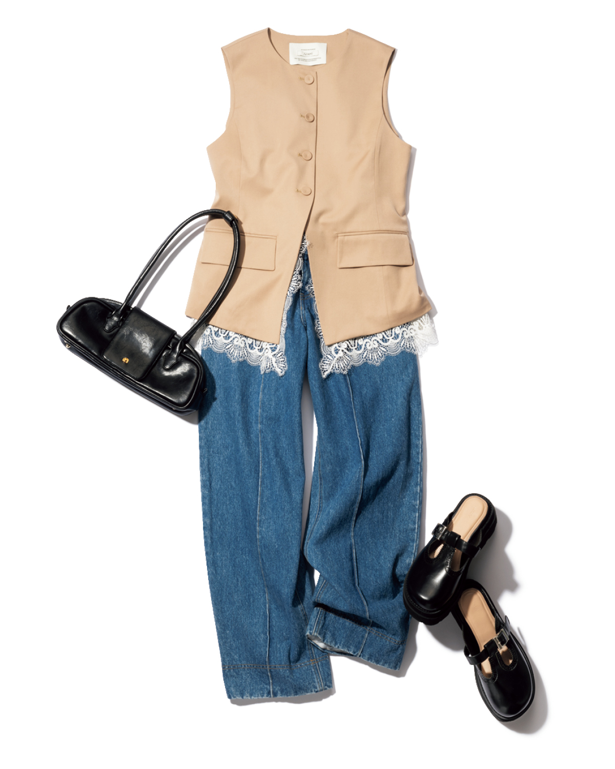 一枚でも着やすいデザインのベストは、ベージュを選んでデニムに合わせるのもサマになる。華やかな裾レース、ハイウエストでカーヴが効いた切り替え、大きめのフラップと計算し尽くされたデザインのおかげで、シンプルなワンツーコーデがお出かけ仕様に。レースは取り外し可能だから、シーンレス・タイムレスに活躍。