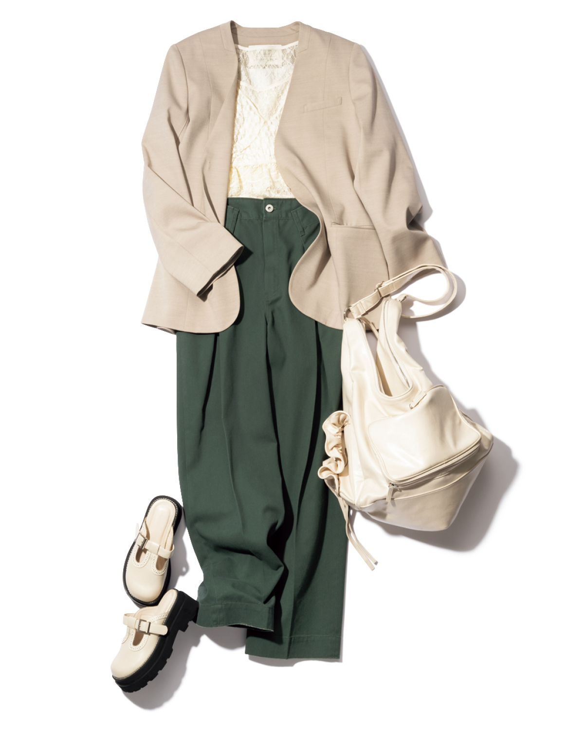 ノーカラージャケット¥33,000 レーストップス¥18,150 パンツ[参考商品] バッグ¥28,600[4月10日発売予定] サンダル¥25,300[3月3日発売予定](すべてアメリ╱アメリ ヴィンテージ)