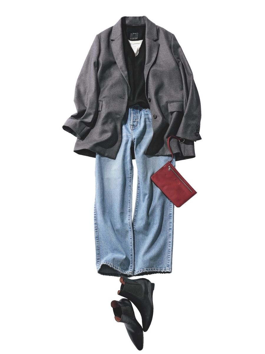 ジャケット×デニムの鉄板ハンサムなカジュアルコーデ。百貨店へのお買い物など、よりキレイめにしたい日はポインテッドトゥの黒ブーツが活躍します。パンプスみたいに上品なのに、公園にも行けるフッ軽さがうれしい。ブーツはペリーコ、デニムパンツはアッパーハイツ、ジャコットはイウエン マトフ、ニットはコンテのもの。