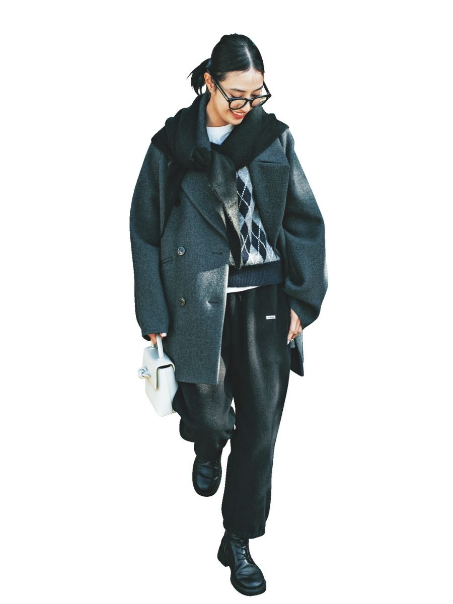 ショートブーツを今っぽく履くなら、まずトライしてほしいのがブーツイン。定番のピーコート×ゆるパンツのスタイルも、足元だけで一気に新鮮に。動きやすさもアップするので、公園や抱っこ期ママのオシャレにもおすすめです。ブーツはツル バイ マリコ オイカワ、コートはカオス、ニットはザラ、フリースパンツはエイトンステイプルズ、スカーフはギャップ。