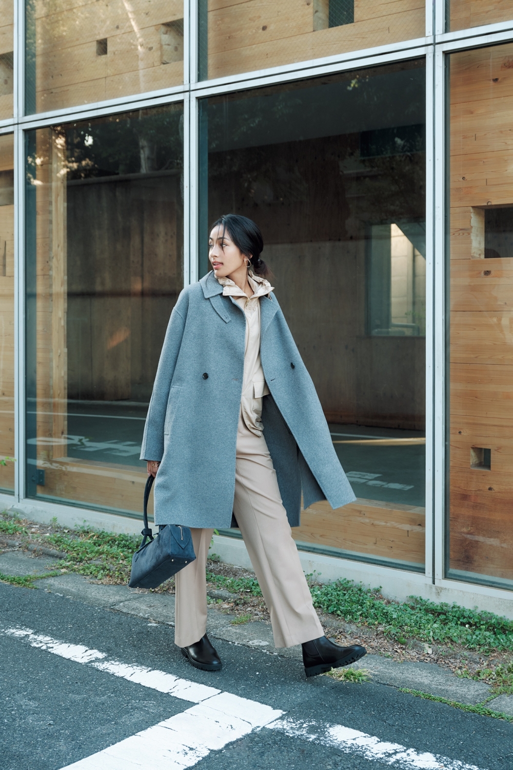 仕事服や参観日などにも使えそうな、キレイめパンツコーデにもすんなりマッチ。パンプスだと寒いし疲れるけれど、スニーカーはラフすぎる。そんな時に黒のショートブーツが活躍します。ブーツ、コート、ブルゾン、パンツ、バッグはすべて23区のもの。
