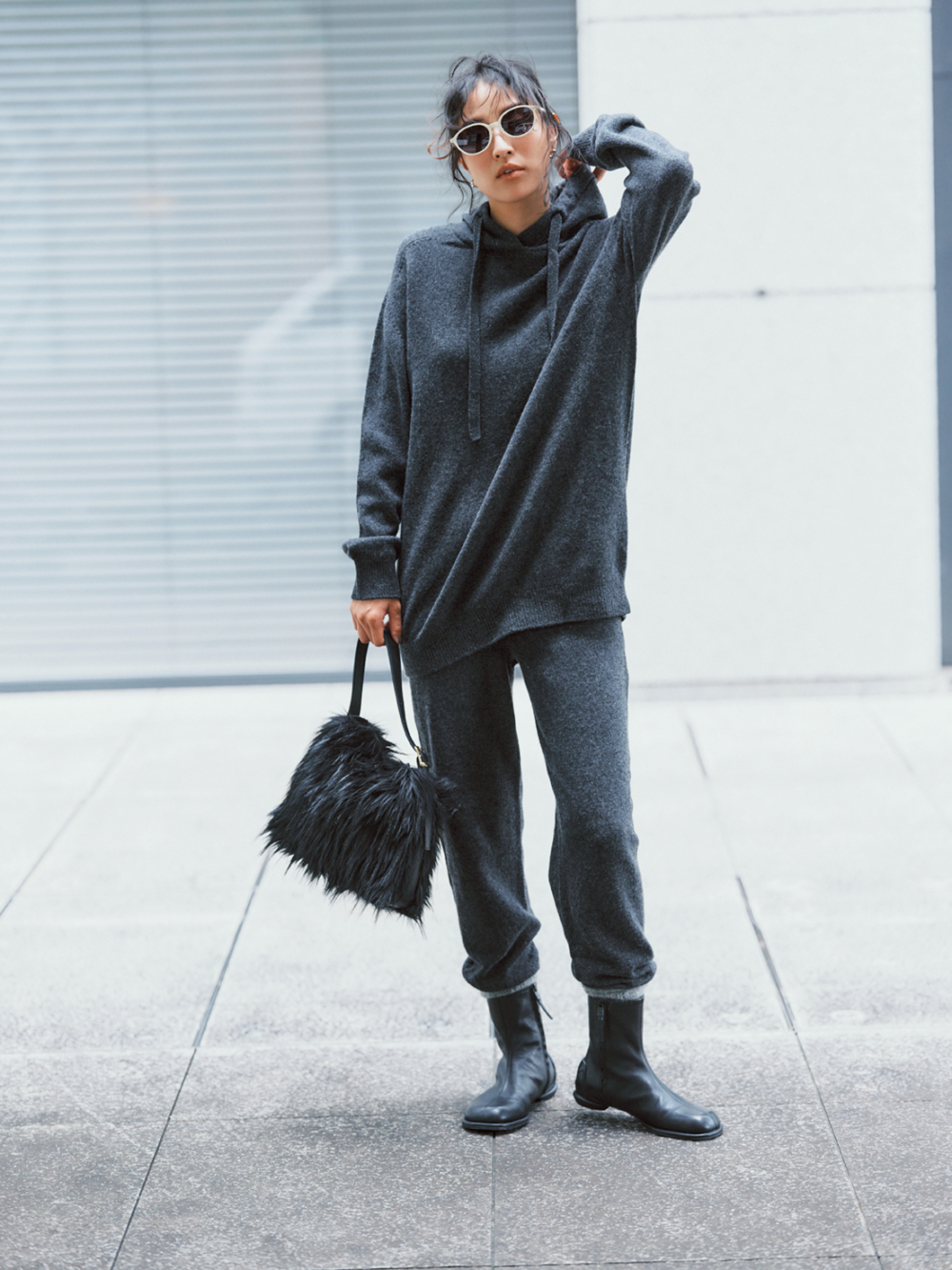 ニットのセットアップをショートブーツで引き締めたスタイル。明るいソックスを挟むことで、ワントーンコーデに抜けがプラスされて部屋着感が消失。旅行などの移動日や、気楽にゆっくりしたい日におすすめです。ブーツはシーセイ、ニットパンツとニットパーカーはWRAY、バッグはモフィオラのもの。