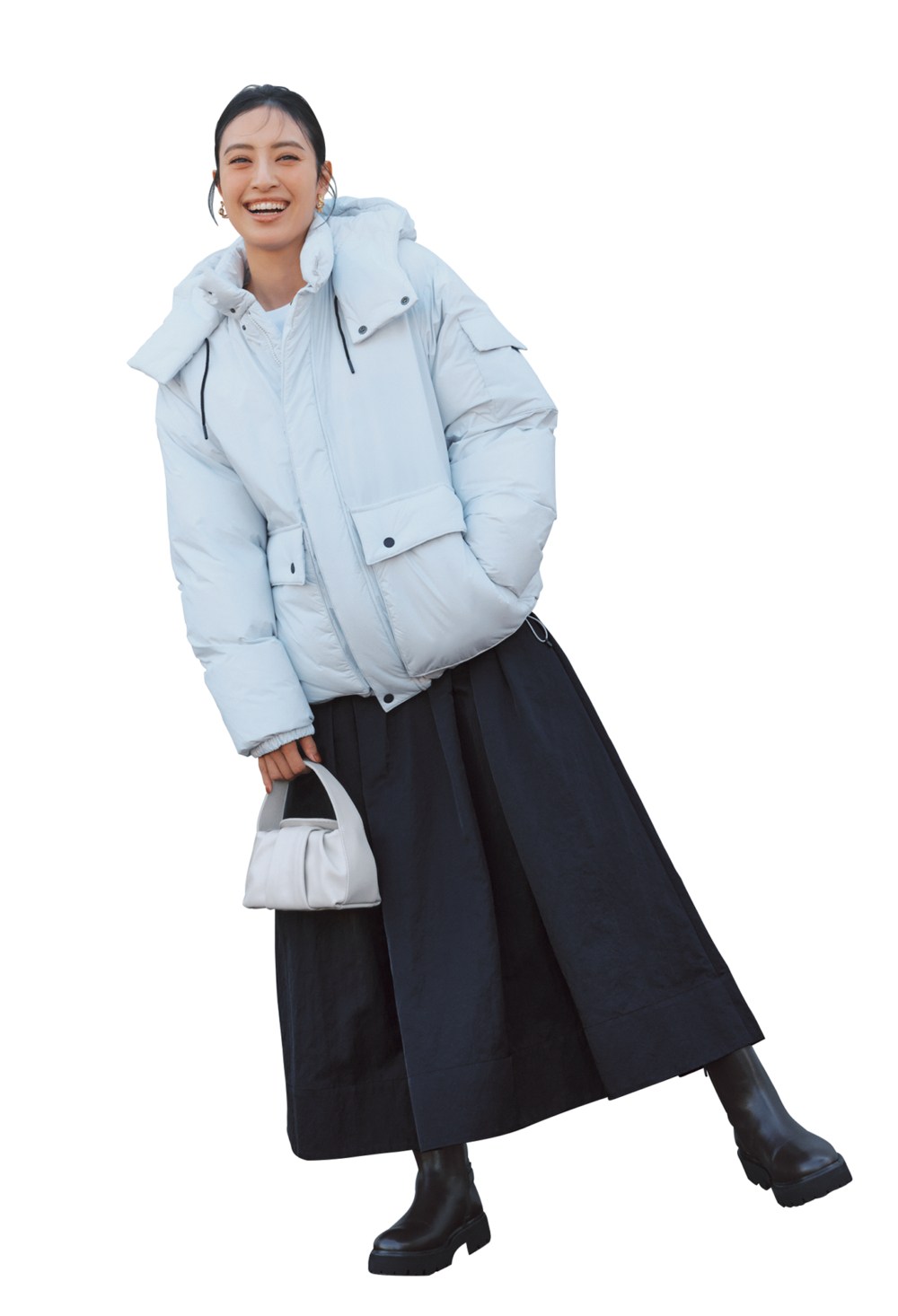 黒のAラインスカートと細身ブーツのセットがあれば、トップスは何を着たってOK。なぜか着るものがない! という日には、まずこのセットで下半身を固めましょう。トップスは明るめカラーを選ぶと、春らしさが出そう。ブーツはカミナンド、ダウンはヘリーハンセン、スカートはアンクレイヴ、バッグはルメンのもの。