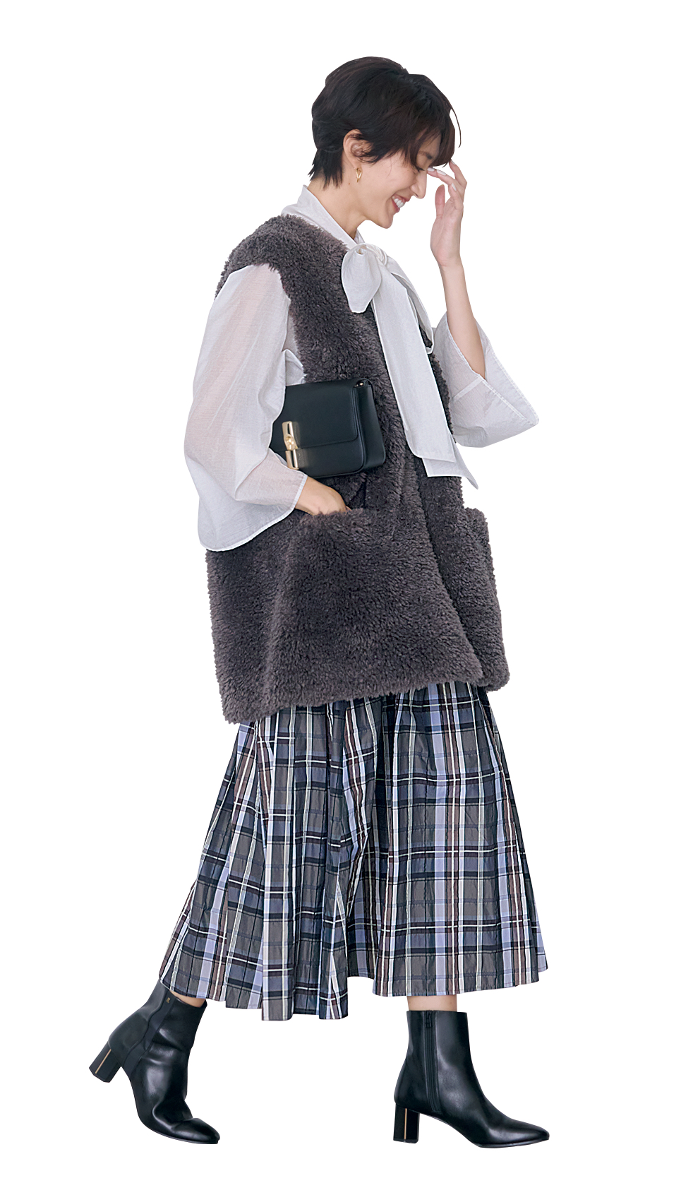 ボウタイブラウスやボアのジレ、ロングスカートといった甘いアイテムを合わせた盛りコーデ。黒のショートブーツがちょうどいい抜けになります。ヒールありなら、休日オシャレの特別感がさらにアップ。ブーツはランバン オン ブルー、ジレはミースロエ、ブラウスはエブール、スカートはアルページュストーリー、バッグはフルラのもの。