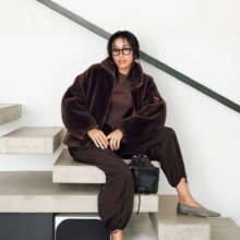 普段から服はモノトーン派ですが、華やぎをプラスするためにトゥモローランドのシャギーベストで素材感を意識。家族でアフタヌーンティーに行くことも多く、夫とさりげなく色をリンクさせて家族のチーム感も重視します。