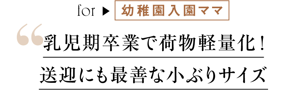 オムツに着替えに、とにかく荷物が入ることが最優先なバッグ選びの時期を経たからこそ、いっそう高まる小バッグへの憧れ。所作までレディに見えるワンハンドルなら、テンションアップも確実。見た目以上の収納力と、深みのある大人なグリーンなら、ネイビーベースの送迎シーンにもマッチ。
