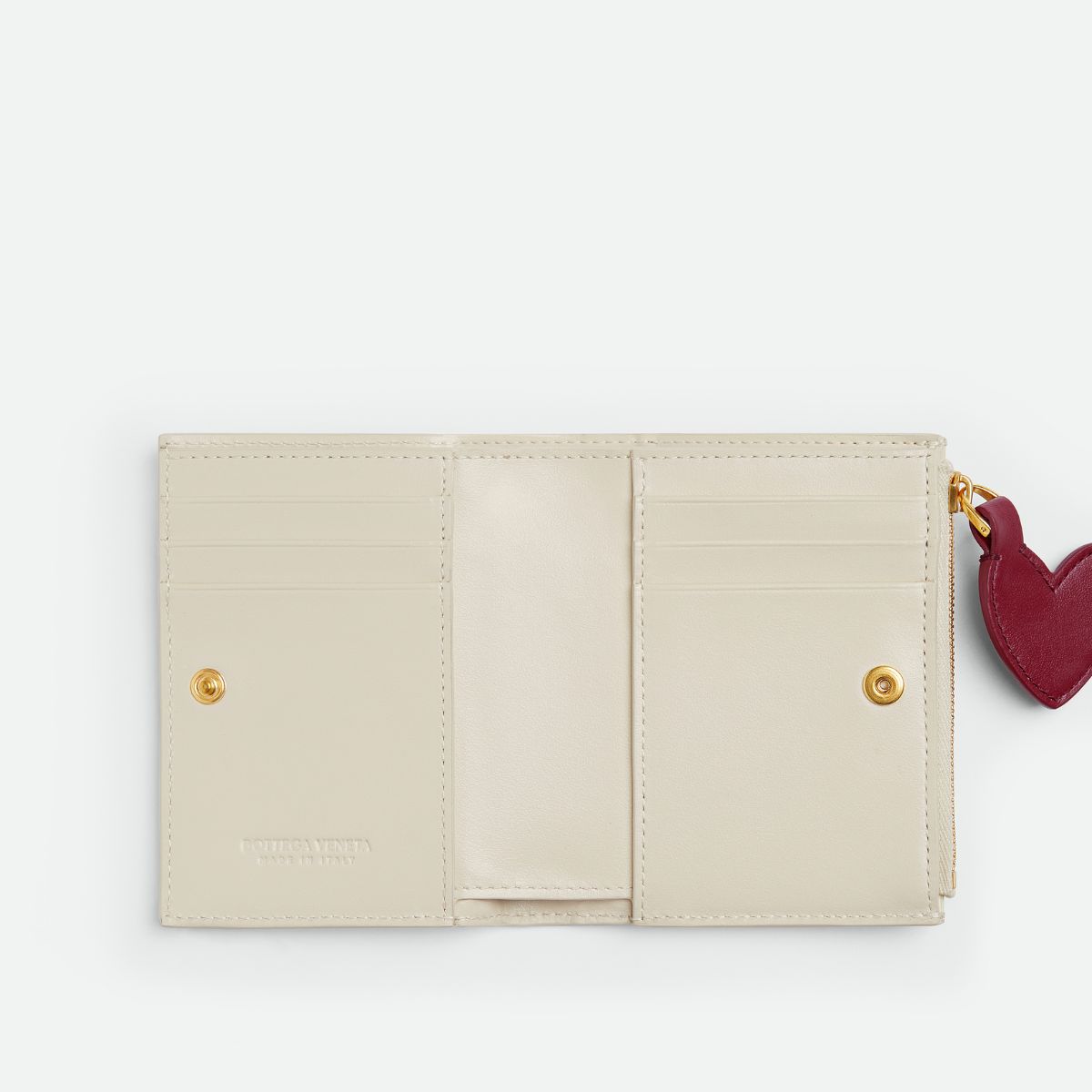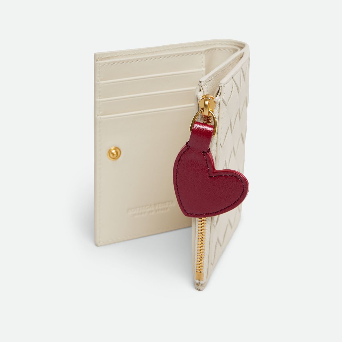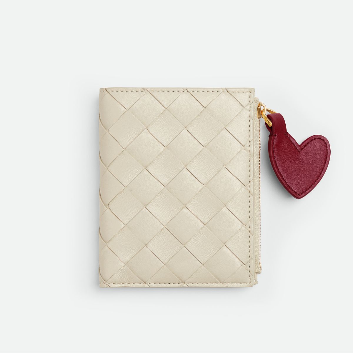 熟練した職人によって編み上げられるイントレチャートのスモールレザーグッズに、ハートのモチーフがプラス。クラフト感のあるフォルムとシックなカラーリングは、まさに大人のためのハート! 上品なシーソルトカラーの二つ折りスモールウォレットはカードスロット6つ、札入れ1つ、ファスナー付きコインパース1つと、収納力も十分です。