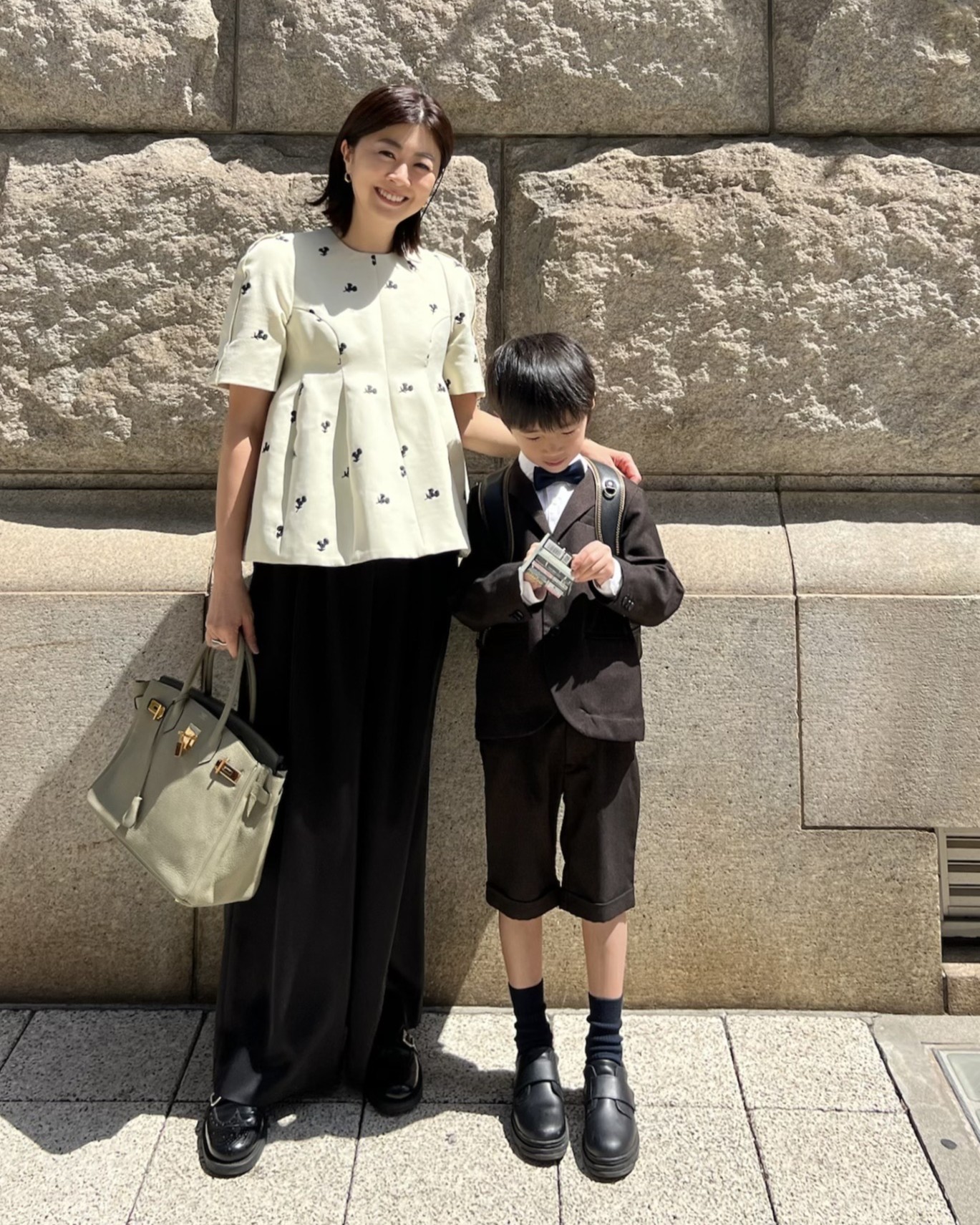 「息子の入学式の日は割と暖かかったので、ジャケットも持っていましたがほぼ半袖で過ごしていました。春らしさを意識して、明るい色味のぺプラムトップスを。花柄刺繍の黒を拾って、黒のワイドパンツでモードにまとめました。上下ともマチャットのものです。荷物は1つにまとめたかったので、当日資料など持ち帰ることも考えてバーキン30のサイズにしました。靴はチャーチ×ミュウミュウのもので歩きやすさを重視」松浦真依子さん・43歳(7歳と4歳の男の子のママ)