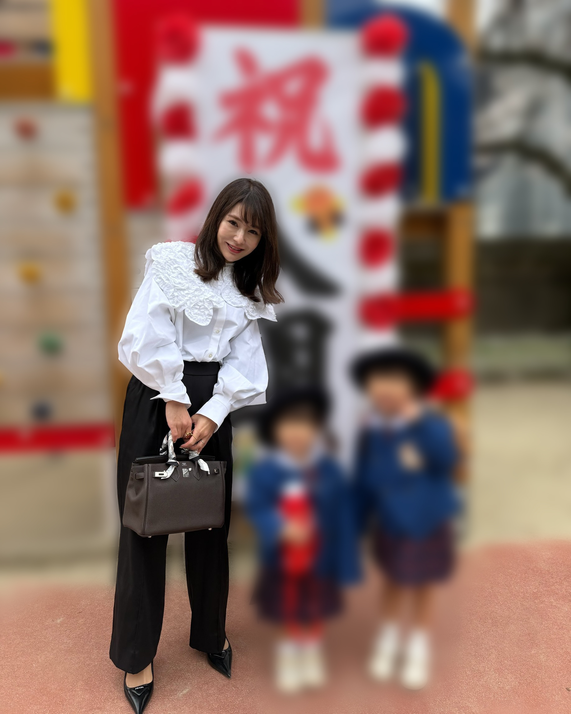 「三女の入園に合わせて、次女も三女と同じ園に転園したので姉妹で一緒の入園式。新たな気持ちで入園式を迎えるので、きちんと感の出るブラウスとテーパードパンツでまとめました。shiroconのブラウスはシワになりにくく、大きめサイズの襟のおかげで一枚でも華やかに仕上げてくれるから気に入っています。プラダのパンプスはヒールありなのに、小走りもできちゃうくらい歩きやすくて子どもたちを連れて歩き回っても痛くならなかったので正解でした。バッグは最低限の必要な荷物がすべて入るエルメスのバーキン25にしました」永原真帆さん・39歳(10歳と6歳と4歳の女の子のママ)