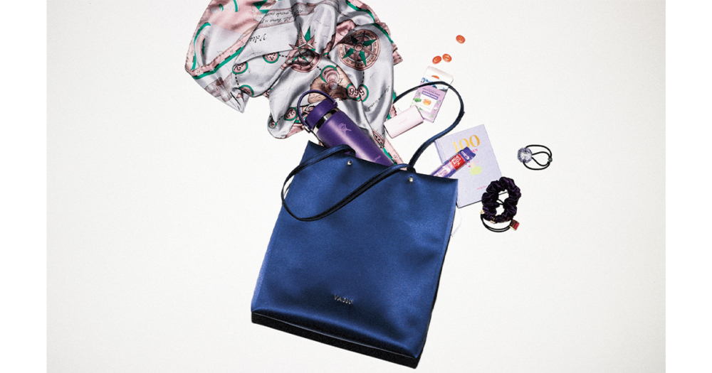 バッグ[H34×W30.5×D13.5cm]¥39,600(ヴァジック/ヴァジックジャパン)スカーフ¥22,000(マニプリ)水筒¥4,730(ハイドロフラスク/アルコ)スクランチー¥5,830シュシュ¥5,830ビジューポニー各¥13,200(すべてザ ヘア バー トウキョウ)その他すべてスタイリスト私物
