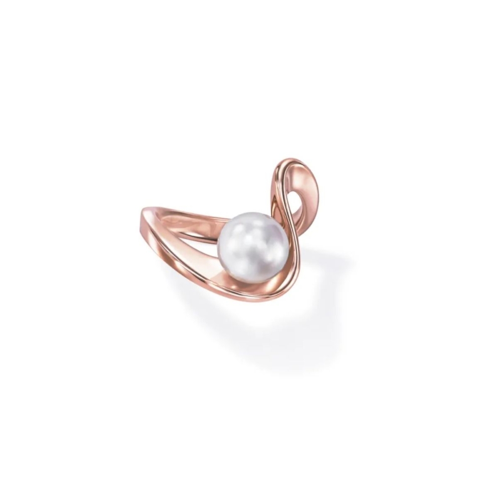 光を受けたしずくが流れ落ちるさまを表現した「カスケード」コレクション。流線型のゴールドのラインは、手元にリズミカルな表情を添えるだけでなく、指をすらっと長く見せてくれる効果も。立体感のあるデザインとまろみのある輝きを持つパールのコントラストが美しいリングです。