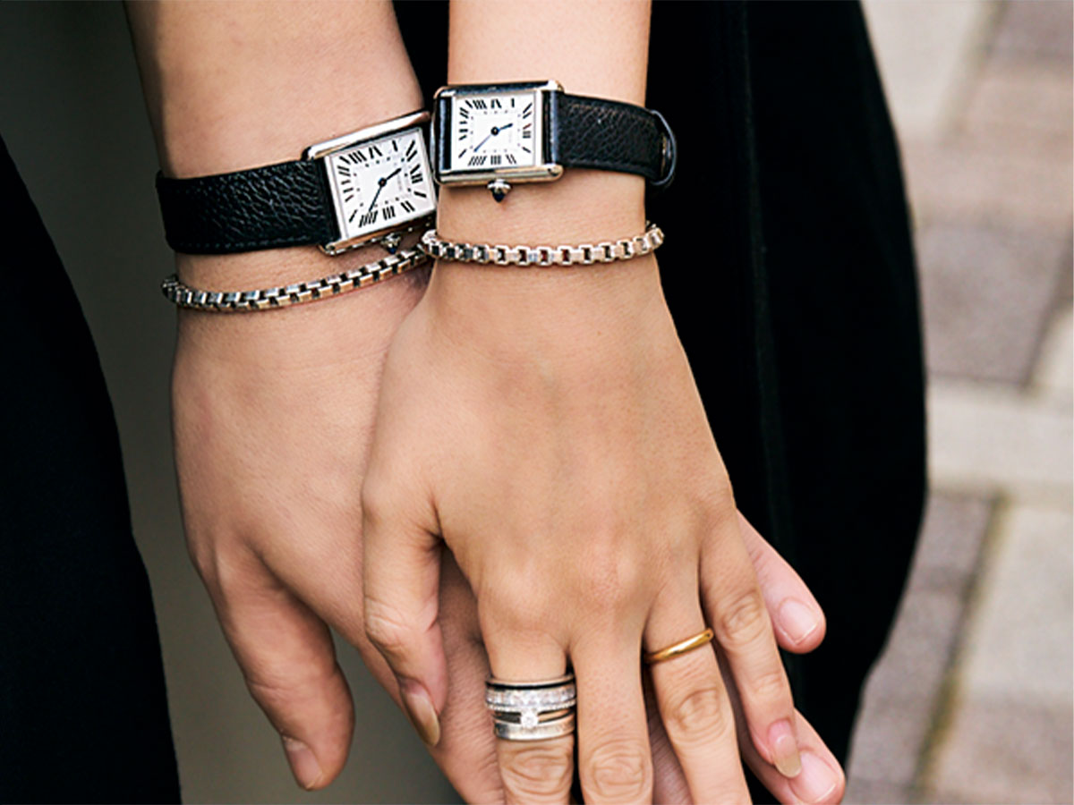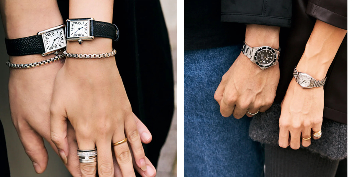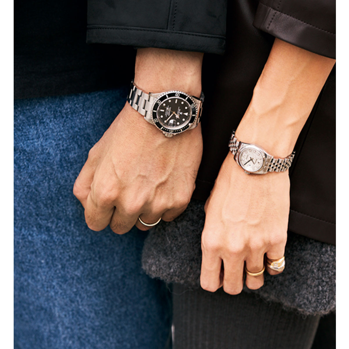 夫がBIOTOPで買った「YUICHI TOYAMA」のメガネはいつのまにか共用に。あまりに使いやすくて、後日私も違うデザインを購入。お互いメガネ好きなのでチーム感もアップ(笑)。夫婦ふたりの時は時計をつけたくて、ロレックスを一緒に。
