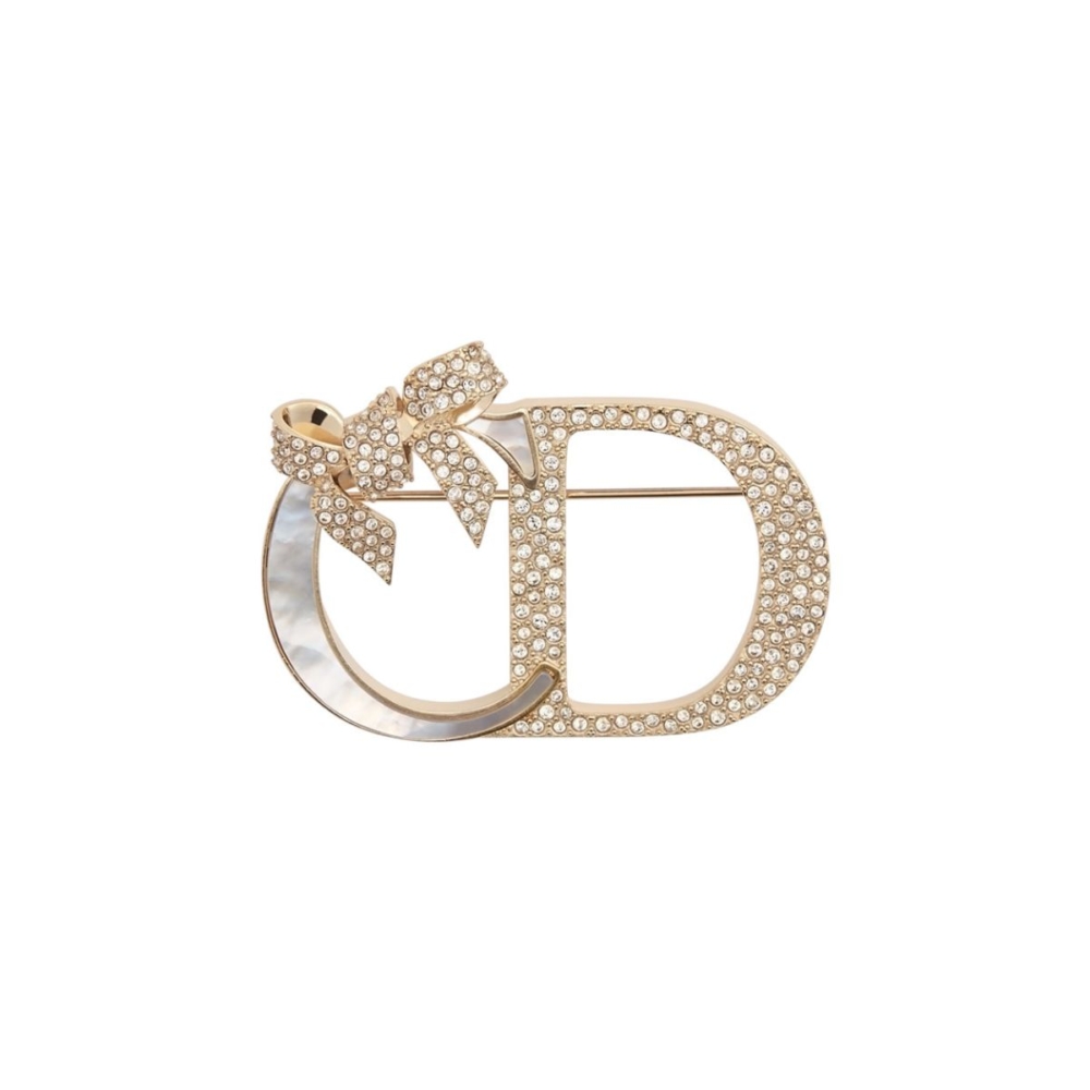 “CD”シグネチャーに、メゾンのアイコニックなコードであるボウ(リボン)をあしらった華やかなブローチ。“D”の部分にはリボンと同じクリスタル、“C”の部分にはマザーオブパールがセットされた、とてもエレガントな仕上がり。ダークカラーのスーツに美しく映えそうです。