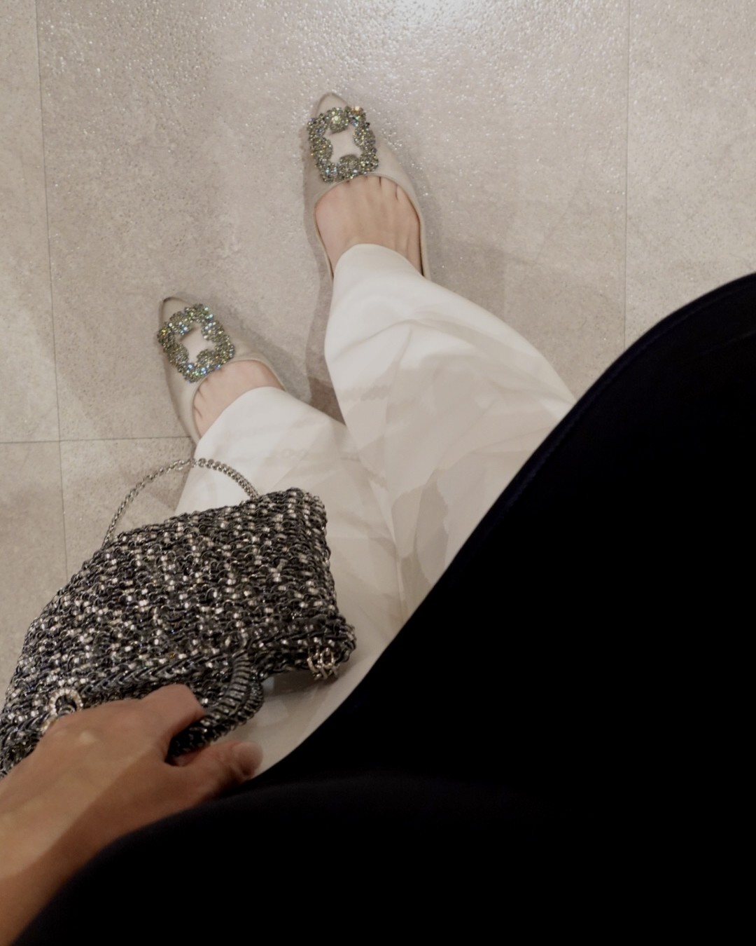 「入園式はホールに入るためにスリッパに履き替えることを案内されていたし、娘たちと式の入場まで一緒にいることを考えるとフラットシューズ一択。おめでたい行事なので、華やかにしたくてビジュー付きのマノロブラニクのハンギシに。ボリュームのあるトップス×パンツで脚長効果を狙いつつ、手首を出してすっきりさせてことでフラットシューズでもスタイルアップを狙いました」(大塩七海さん・32歳/3歳双子の女の子のママ)