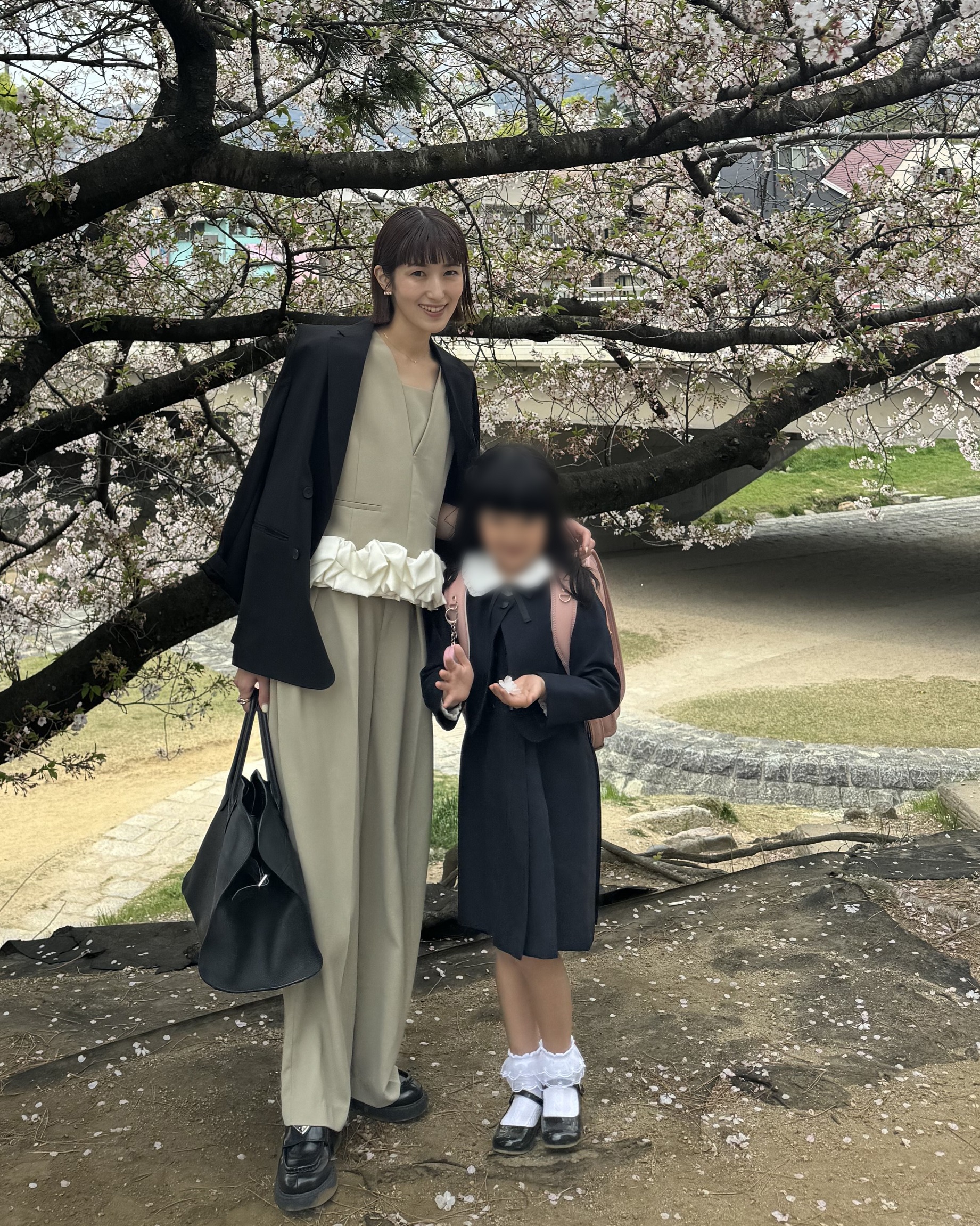 「入学式なので全体を明るいイメージにまとめたく、足元も馴染むベージュにしました。ブーツを取り入れることで、洋服のコンサバ感を払拭します。息子がまだまだやんちゃな時期なので、フラット感覚の3センチヒールのタビブーツなら、動きやすくて安心でした」橋詰まどかさん・39歳(10歳女の子と7歳男の子のママ)