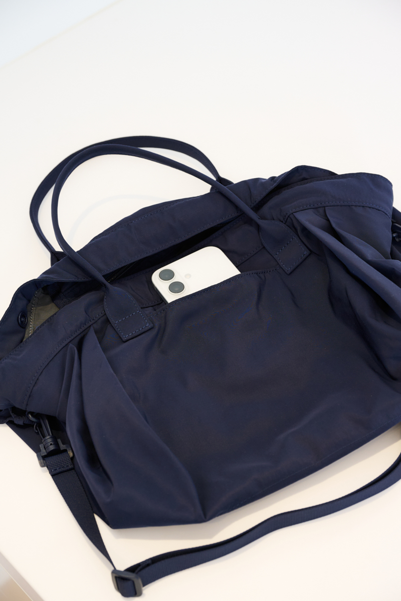 ドロストをギュッと絞って、ミニバッグ風に。落ち着いたネイビーの色合いは、デニムジャケットやスウェットなどどんなアイテムにも似合います。