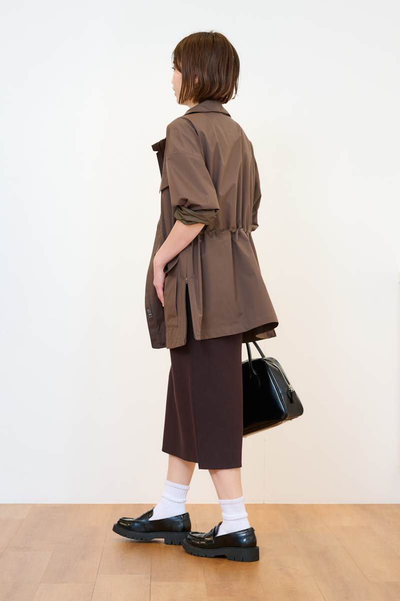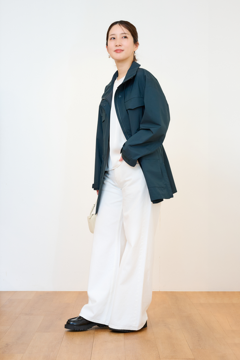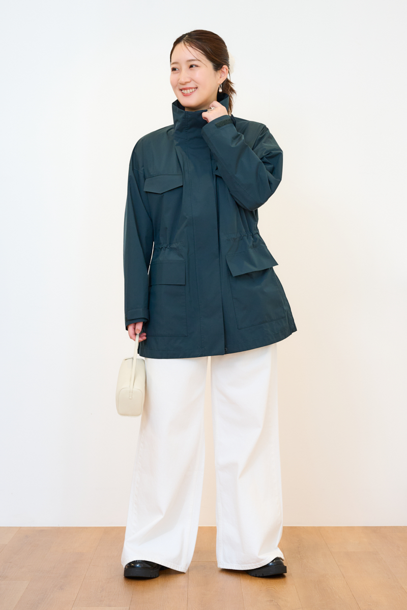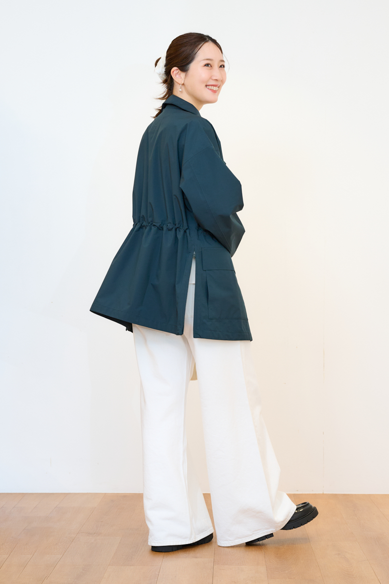 撥水機能と防風性を併せ持ったハイスペアウター。春先の予期せぬ小雨や自転車送迎時の風対策にもなるので、ママ要チェックのアイテムです。サイドのスリットファスナーやウエストのドローコードを絞ってシルエットを自由に調整可能。前を全締めしてスタンドカラーを活かす着こなしもモードライクで素敵です。