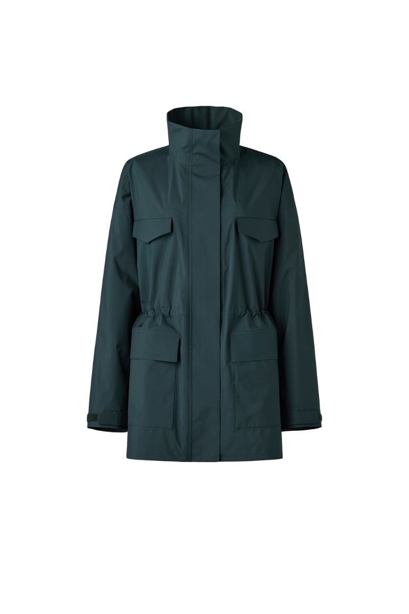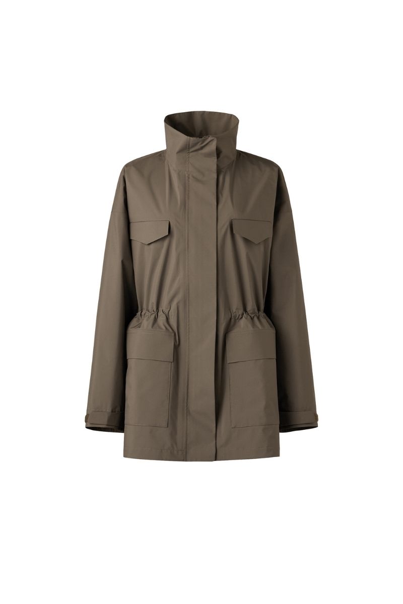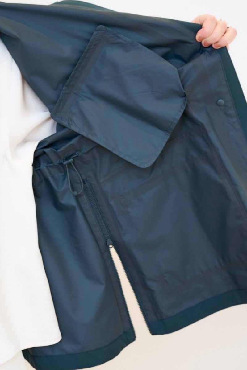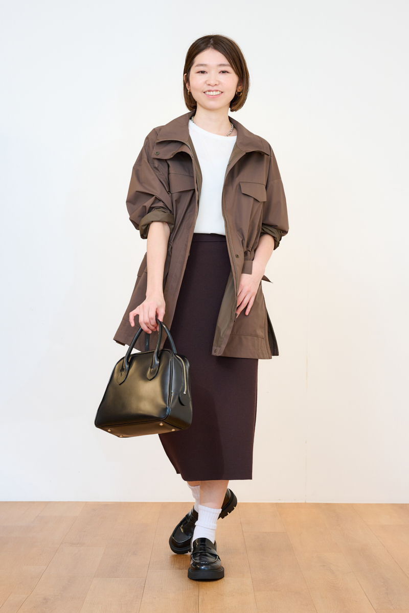 撥水機能と防風性を併せ持ったハイスペアウター。春先の予期せぬ小雨や自転車送迎時の風対策にもなるので、ママ要チェックのアイテムです。サイドのスリットファスナーやウエストのドローコードを絞ってシルエットを自由に調整可能。前を全締めしてスタンドカラーを活かす着こなしもモードライクで素敵です。