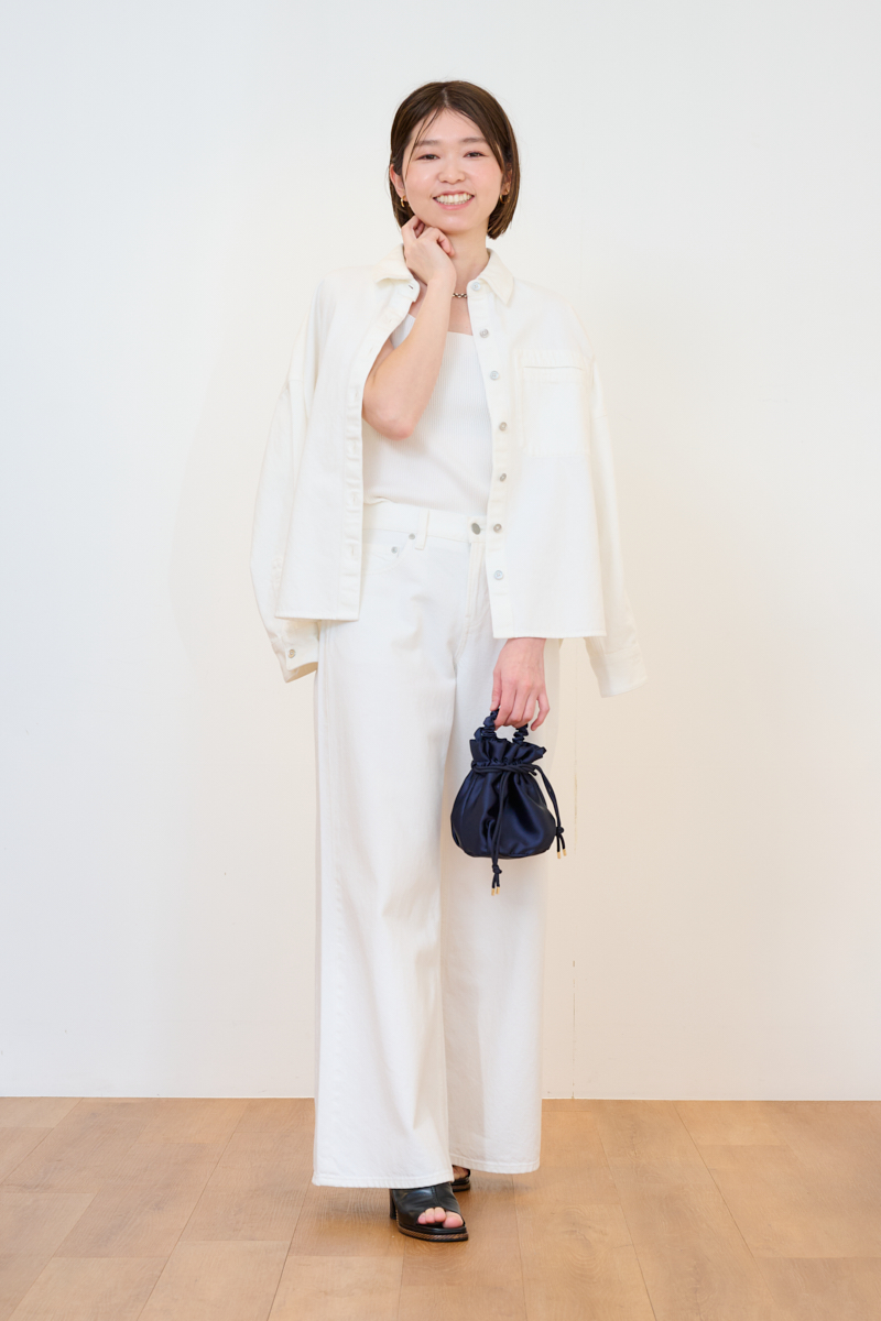 【白デニムコーデ】デニムリラックスシャツジャケット¥4,990 3Dリブスクエアネックセーターノースリーブ¥2,990 ローライズワイドジーンズ¥4,990(ともにユニクロ:シー/ユニクロ)その他ライター私物
