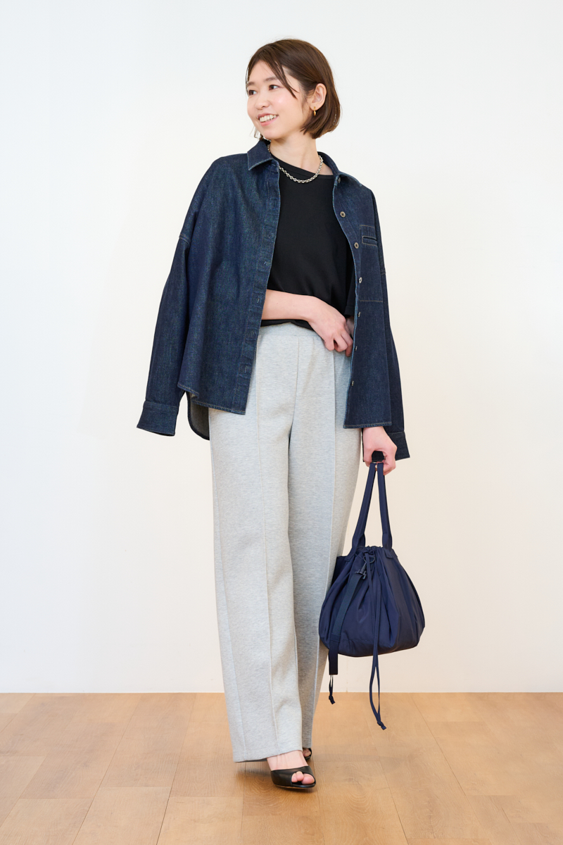 【ブルーデニムコーデ】デニムリラックスシャツジャケット¥4,990 ボクシーニットT¥2,990 スウェットストレートパンツ¥3,990 ドローストリングバッグ¥2,990(すべてユニクロ:シー/ユニクロ)その他ライター私物