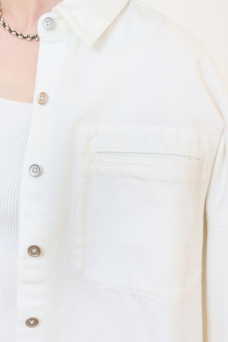 分厚すぎず薄すぎずなシャツとジャケットの中間のような生地と、すっきりしたボタンや胸ポケットなどのミニマルな仕上がりが使いやすい! ほどよいリラックスシルエット&ジャストな着丈なので、ワンツーコーデに羽織るだけで今っぽさを出せます。オールホワイトで合わせれば、ママ友ランチにぴったりな華やかさも。春夏は羽織りに、秋冬はコートのインナーにと着回し力の高さも特筆ものです。