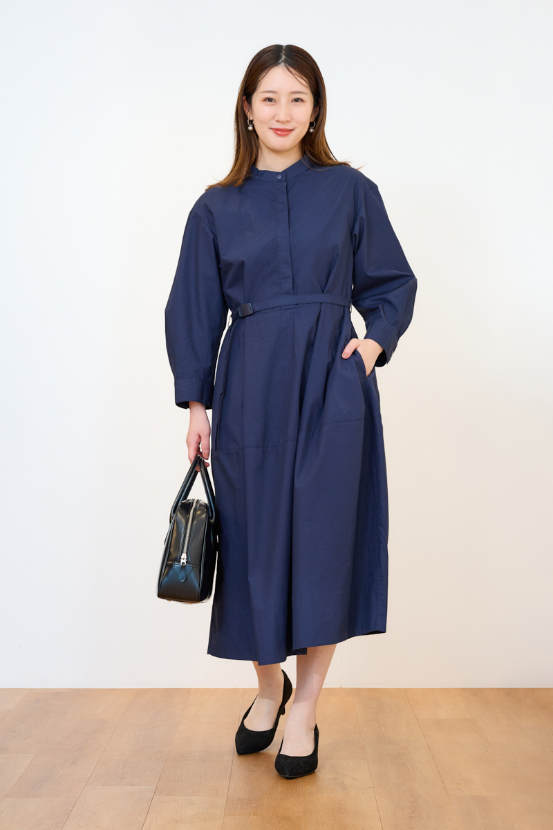 ほどよくボリュームがある7分袖のシャツワンピース。スカートがバルーンシルエットになっているので、シンプルですがほんのり甘い印象に。バックルベルトをキュッと絞って、ウエストを強調させればスタイルアップ効果も絶大。端正なワンピースなので、子どもの行事や幼児教室の送迎、参観日など母業でも頼れる一着になるはず。胸元がスナップボタンで開くので、授乳もできます。