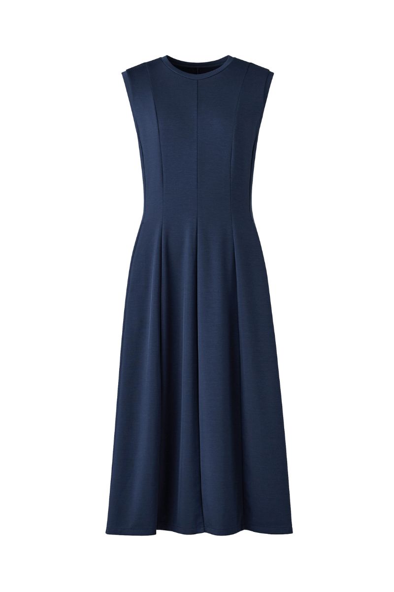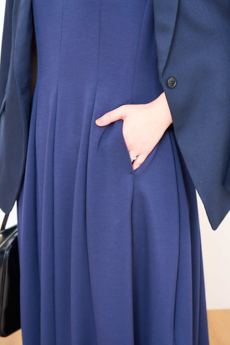 切り替えによる構築的なシルエットで、自然とスタイルが良くみえるワンピース。柔らかくストレッチの効いた生地で、スウェット並みに快適な着心地も魅力です。平日はジャケットやカーディガンを羽織って仕事や母業に、休日はシャツとスニーカーでカジュアルに着こなすなど汎用性も申し分なし。