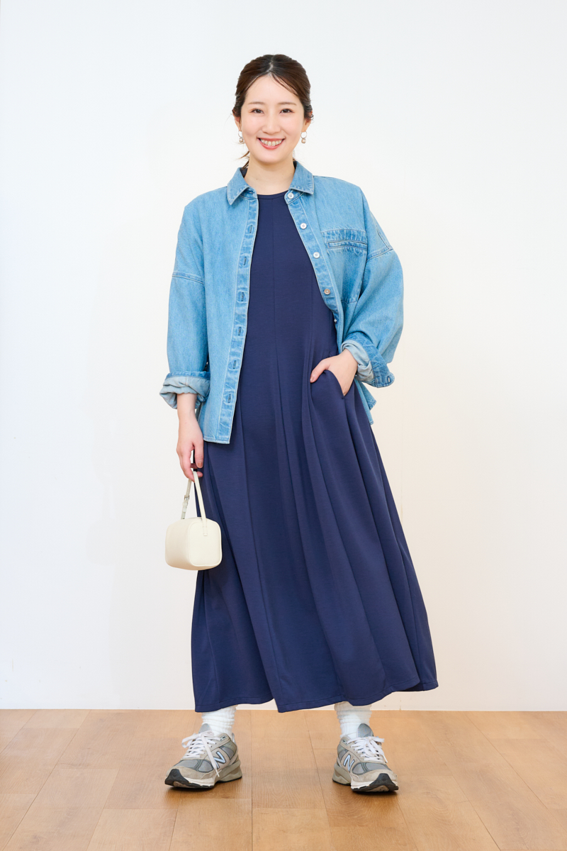 【デニムジャケットコーデ】デニムリラックスシャツジャケット¥4,990 フィットアンドフレアワンピース/ノースリーブ¥4,990(すべてユニクロ:シー/ユニクロ)その他ライター私物
