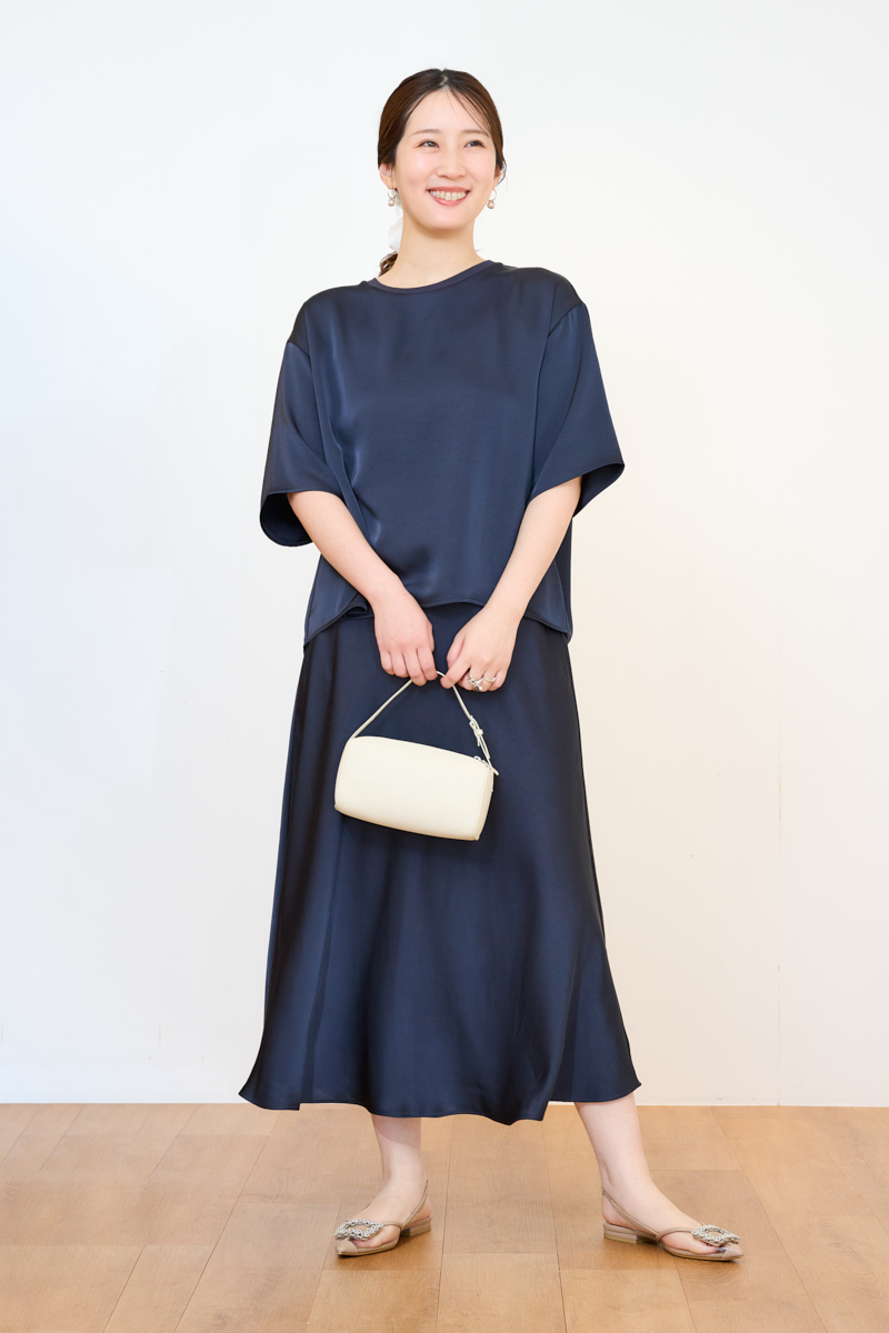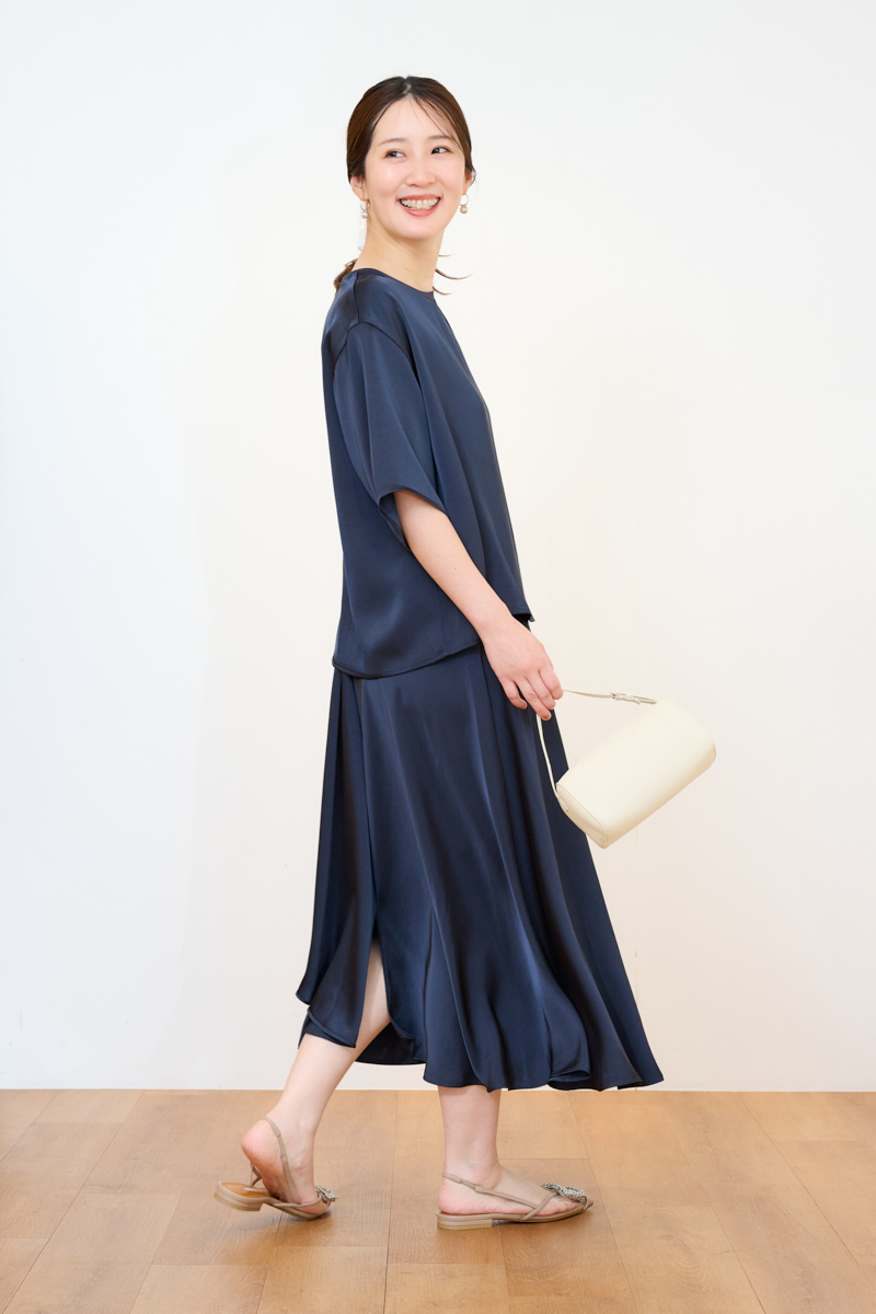 サテン生地のセットアップなら、Tシャツ軸でもカジュアルさを一切感じさせずエレガント! 学校行事はもちろん、ママ友とホテルランチにも着ていけるほど優美なデザインが秀逸。サラッとした肌触りの良い素材で、暑い日も快適に過ごせます。あえてトップスはインせず、涼しげに着こなすのが素敵です。