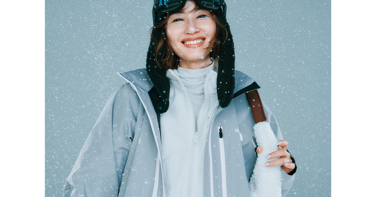 スノージャケット[レイバックライド]¥79,200(ザ・ノース・フェイス╱ゴールドウイン カスタマーサービスセンター)中に着たブルゾン[撥水]¥49,500パンツ¥36,300(ともにY╱イレーヴ)タートルネックトップス[ヒートテック]¥2,290(ユニクロ:シー╱ユニクロ)ダウンワッチキャップ[800FP]¥4,950(タイオン)ゴーグル¥26,620(オークリー╱ルックスオティカジャパン カスタマーサービス)グローブ¥7,480(Reusch╱SKI SHOP JIRO 青山)バッグ¥28,600(ハンター╱ハンタージャパン カスタマーサービス)