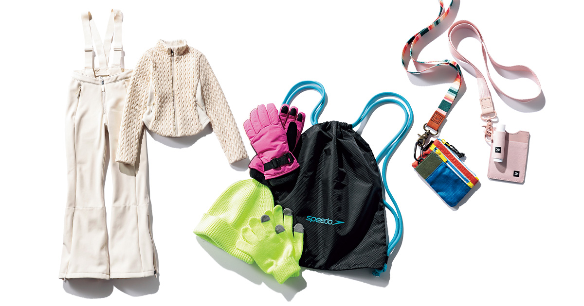 スノージャケット¥268,400スノーパンツ¥154,000(ともにマッカージュ╱ジェイプラスインターナショナル)ボアベスト[通気性]¥41,800(ウールリッチ アウトドア レーベル╱ウールリッチ アウトドア レーベル 代官山店)カットソー[メリノ150]¥16,500(アイスブレーカー╱ゴールドウイン カスタマーサービスセンター)ニットキャップ¥14,300(ウールリッチ╱ウールリッチ 二子玉川店)ゴーグル¥68,200(クロエ╱ケリング アイウエア ジャパン カスタマーサービス)グローブ[900FP+]¥5,940(タイオン)ピアス[撥水]¥2,499(H&M Move╱H&M カスタマーサービス)ボトルサコッシュ¥11,550ストラップ¥5,170(ともにトポロジー╱トポロジー フラッグシップ ショップ)スノーブーツ¥34,100(ハンター╱ハンタージャパン カスタマーサービス)