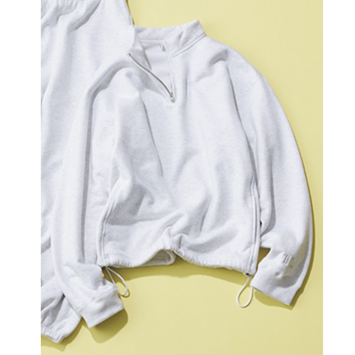 白っぽグレーが絶妙なハーフジップスウェットセットアップ 部屋着感はクリーンな色みで難なく解消! スウェットセットアップ¥55,000(ザハイライツ)[ハーフジップのみ]