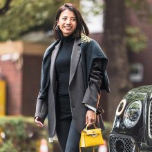 レギンス¥8,800(ステートオブマインド/ゲストリスト)ジャケット¥29,700(アメリ/アメリ ヴィンテージ)ぺプラムブラウス¥35,200(ル フィル/ル フィル ニュウマン 新宿店)バッグ¥41,800(フィールザテイスト/エッセンス オブ アナイ/アナイ)パンプス¥34,100(ファビオ ルスコーニ/伊勢丹新宿本店 本館2階 婦人靴)