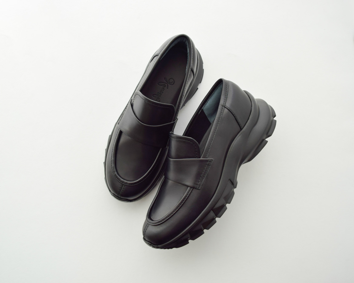 ローファー感の強いアッパーデザインで、通勤にもおすすめな一足。4.5cmヒールのボリュームソールは見た目に反して軽量で、「かっこいいけど履き疲れしない」を実現。従来よりもゆったりめに作った新木型を使用していて、ローファーが苦手な幅広さんも安心です。