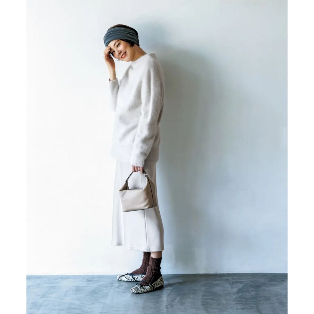 バレエシューズ¥47,300(ヒューン/エストネーション)ソックス¥3,300(ブルーフォレ/リトルリーグ インク)ニット※11月展開予定¥37,400(アンタイトル)スカート¥29,700(ザハイライツ)ヘアバンド¥6,930(カシラ/カシラプレスルーム)リング¥4,950(アビステ)バッグ¥253,000(ヴァレクストラ/ヴァレクストラ ジャパン)