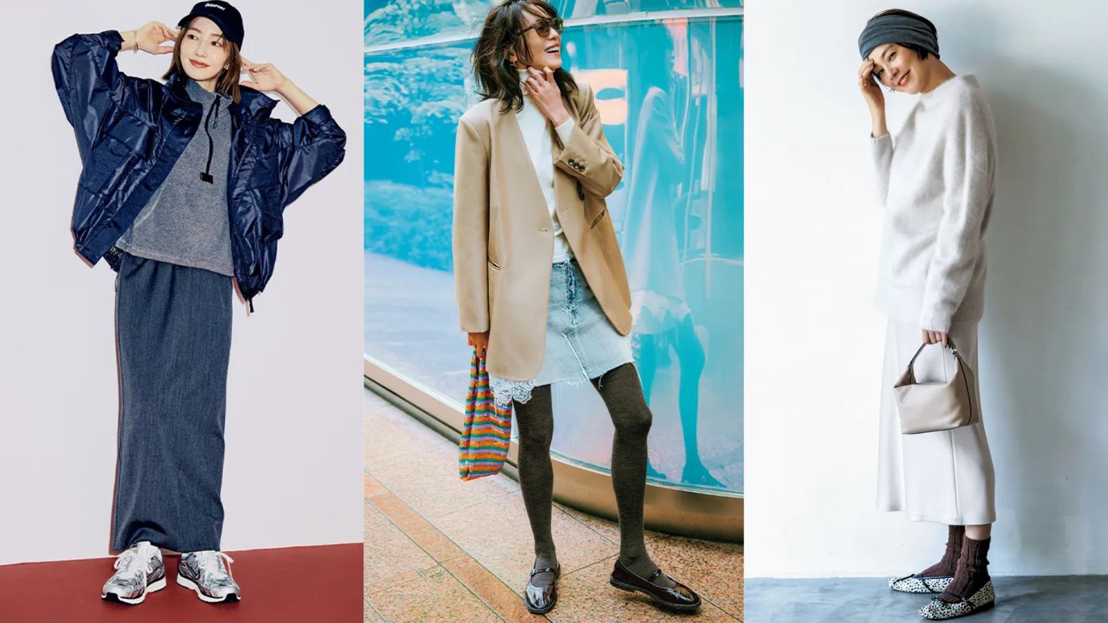 スカート¥22,000(エミ/エミ ニュウマン新宿店)ジャケット¥42,900〈アンスクリア〉ブラウス¥53,900〈フィナモレ〉(ともにアマン)ブラックバッグ¥29,700(カレンソロジー/カレンソロジー 二子玉川)トートバッグ¥4,290(エル・エル・ビーン/L.L.Bean カスタマーサービスセンター)スニーカー¥27,500(ヴェジャ/シードコーポレーション)ソックス¥3,850(シー/エスストア)